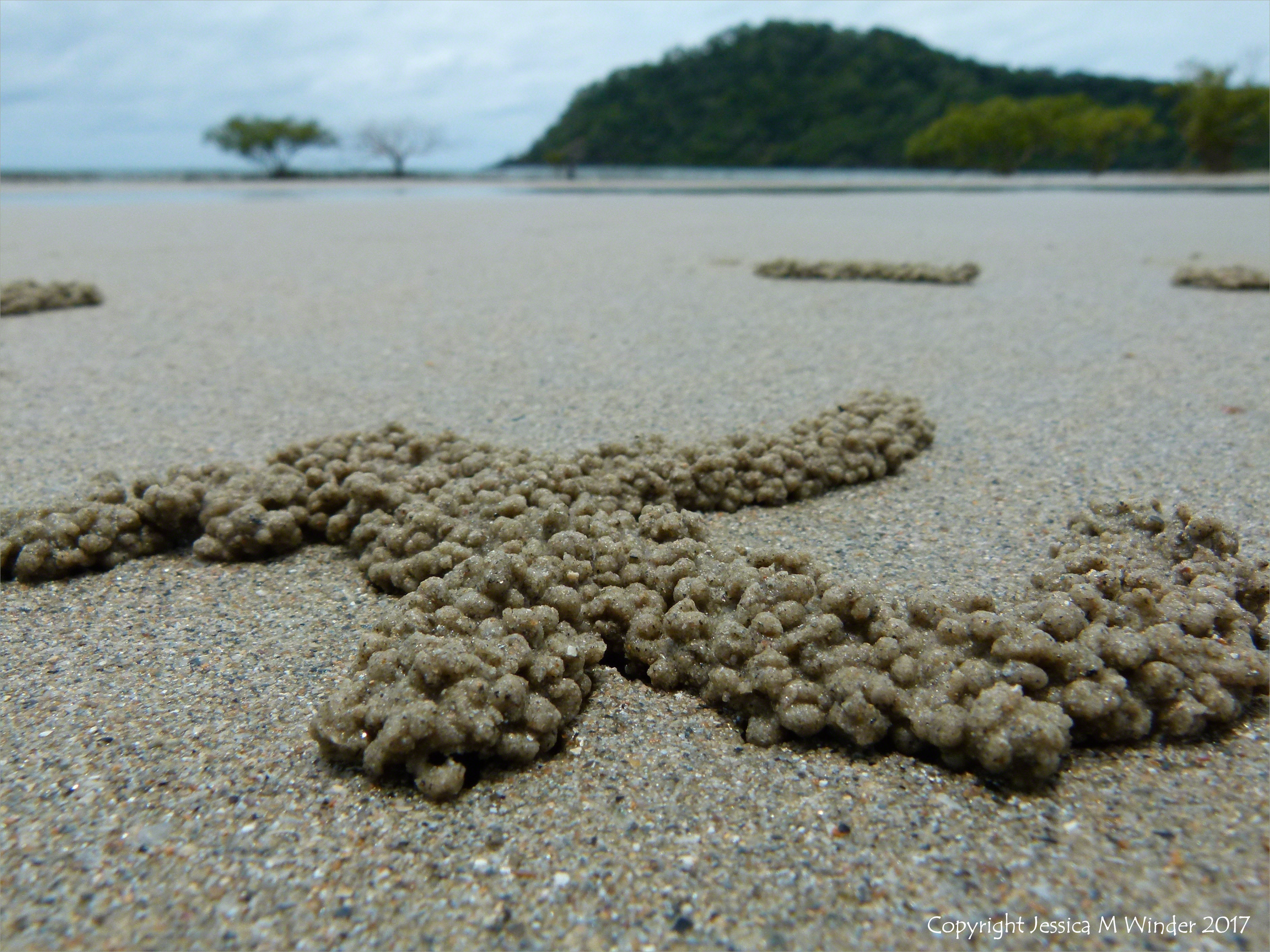 Patterns Made by Feeding Crabs 6 – Patterns of sand pellets from the feeding activities of crabs in wetter enriched beach sediments near shore-growing vegetation on Cape Tribulation beach where the rainforest meets the sea in Queensland, Australia.