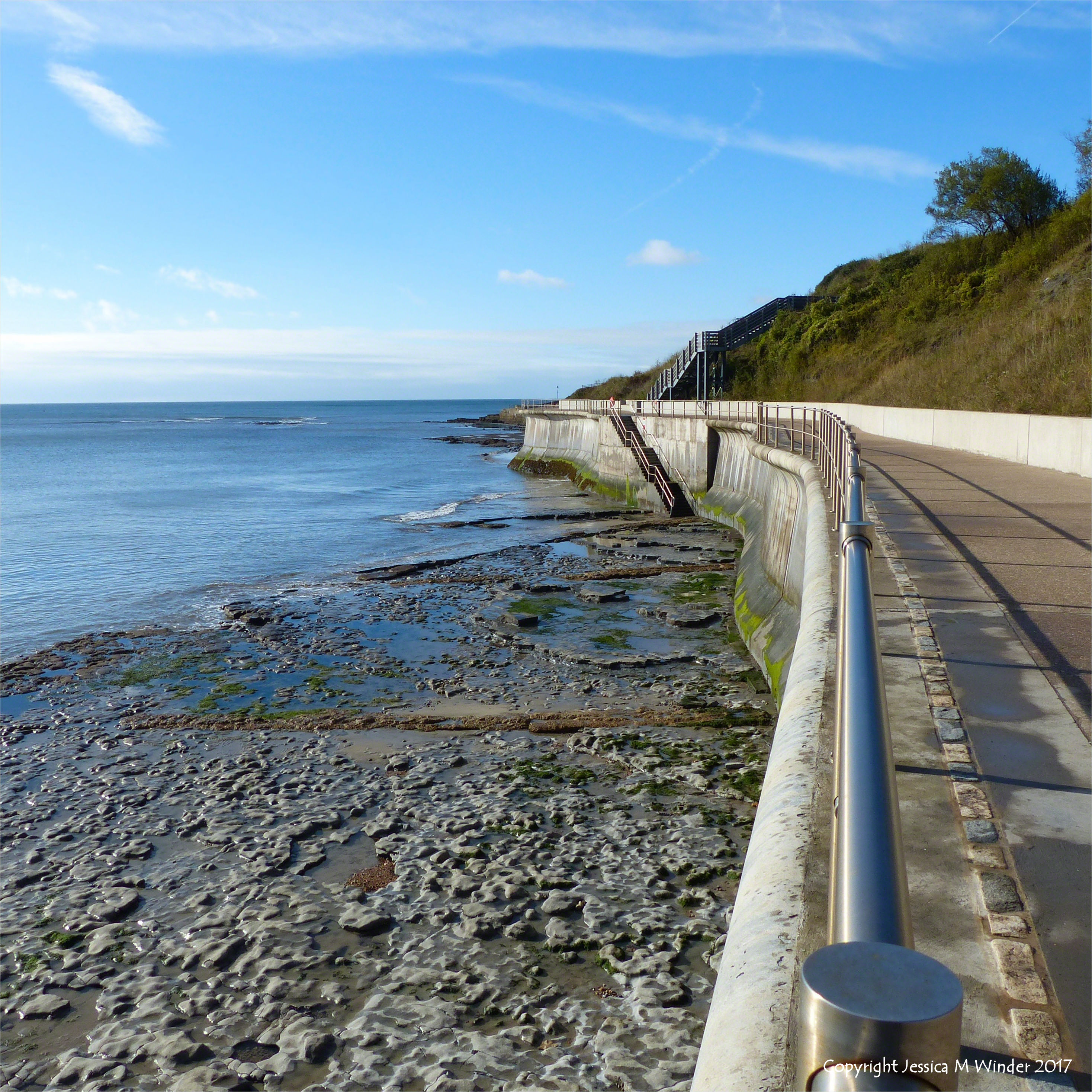 Below the New Sea Wall LR 7 – View looking west from the walkway on the new sea wall at Lyme Regis on Dorset’s Jurassic Coast, showing the bare rock platform on the shore and lines of concrete footings from the demolished breakwaters.