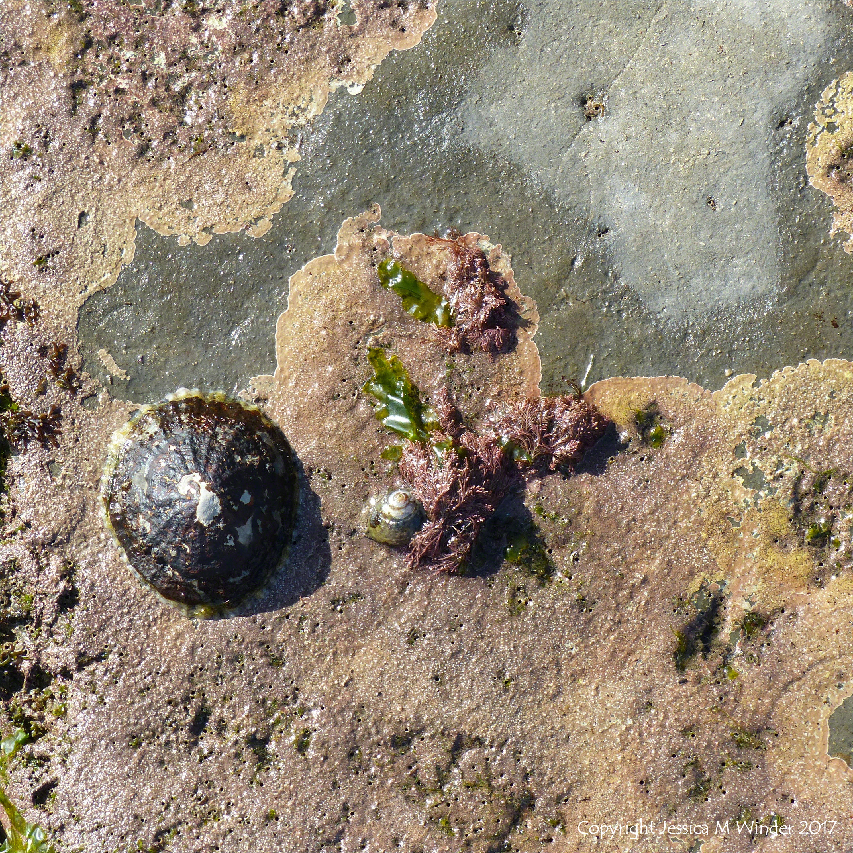 Below the New Sea Wall LR 32 – Blue Lias limestone with a coating of Pink Paint calcareous encrusting seaweed, and grazing limpet and Top Shell, on the shore below the new sea wall at Church Cliffs in Lyme Regis, Dorset.