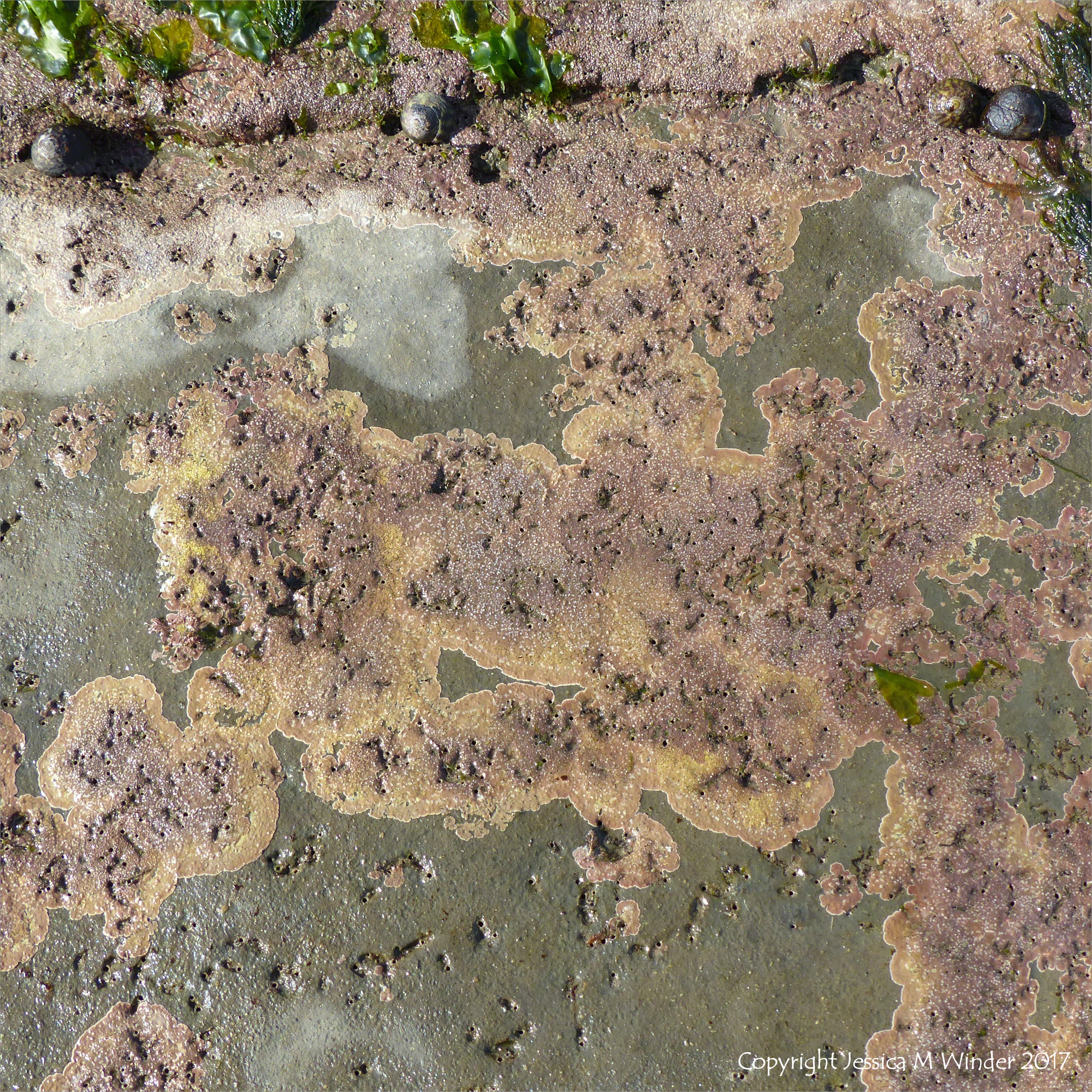 Below the New Sea Wall LR 34 – Pink Paint encrusting calcareous seaweed (Lithamnion) growing on Blue Lias limestone and perforated by many occupied burrows of marine polychaete worms (Polydora spp.). Photographed on the rock ledges below the new sea wall at Church Cliffs in Lyme Regis, Dorset.