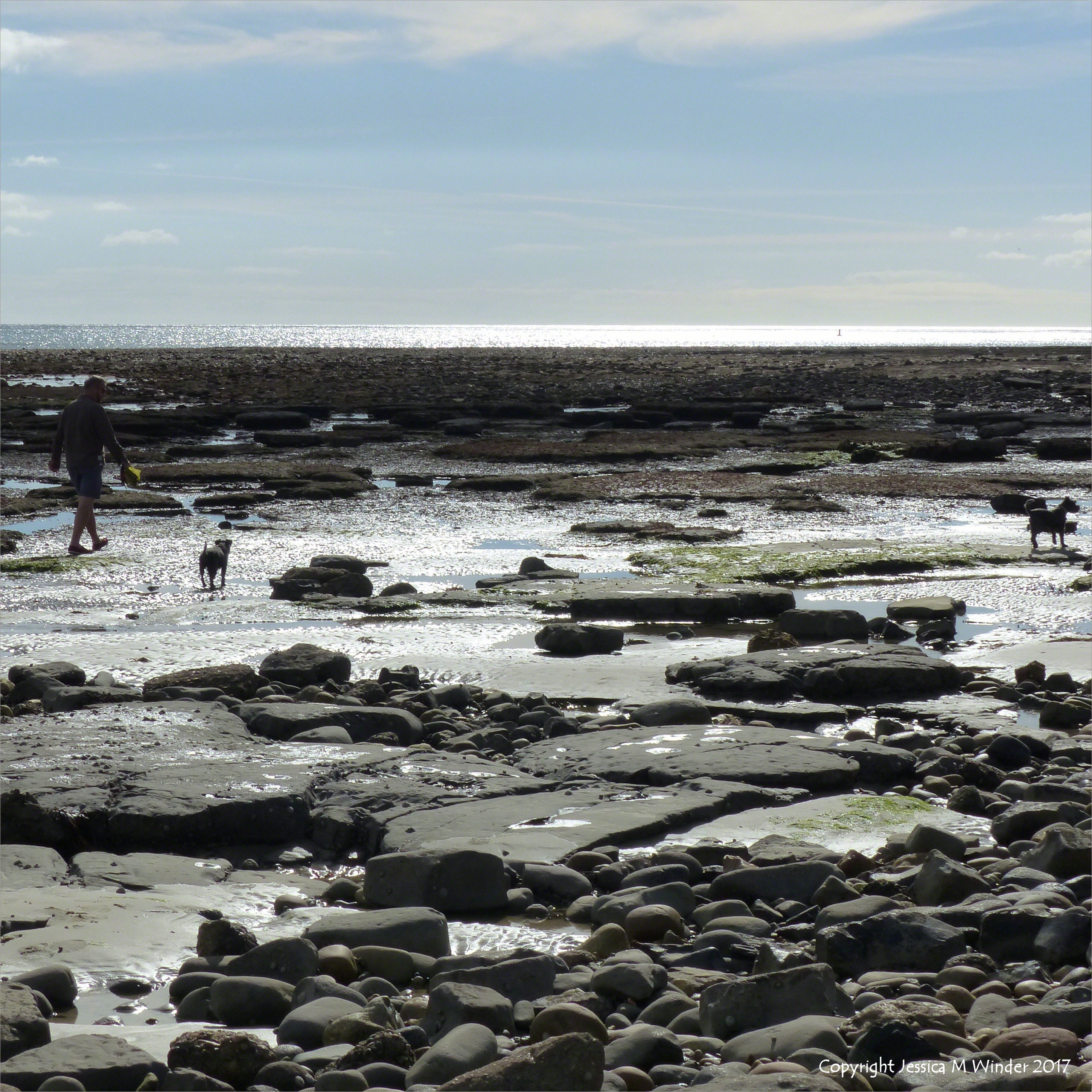 Below the New Sea Wall LR 36 – View of the rocky ledges below the new sea wall at Lyme Regis in Dorset, England. Looking into the sun. Man walking with dogs across the rocks
