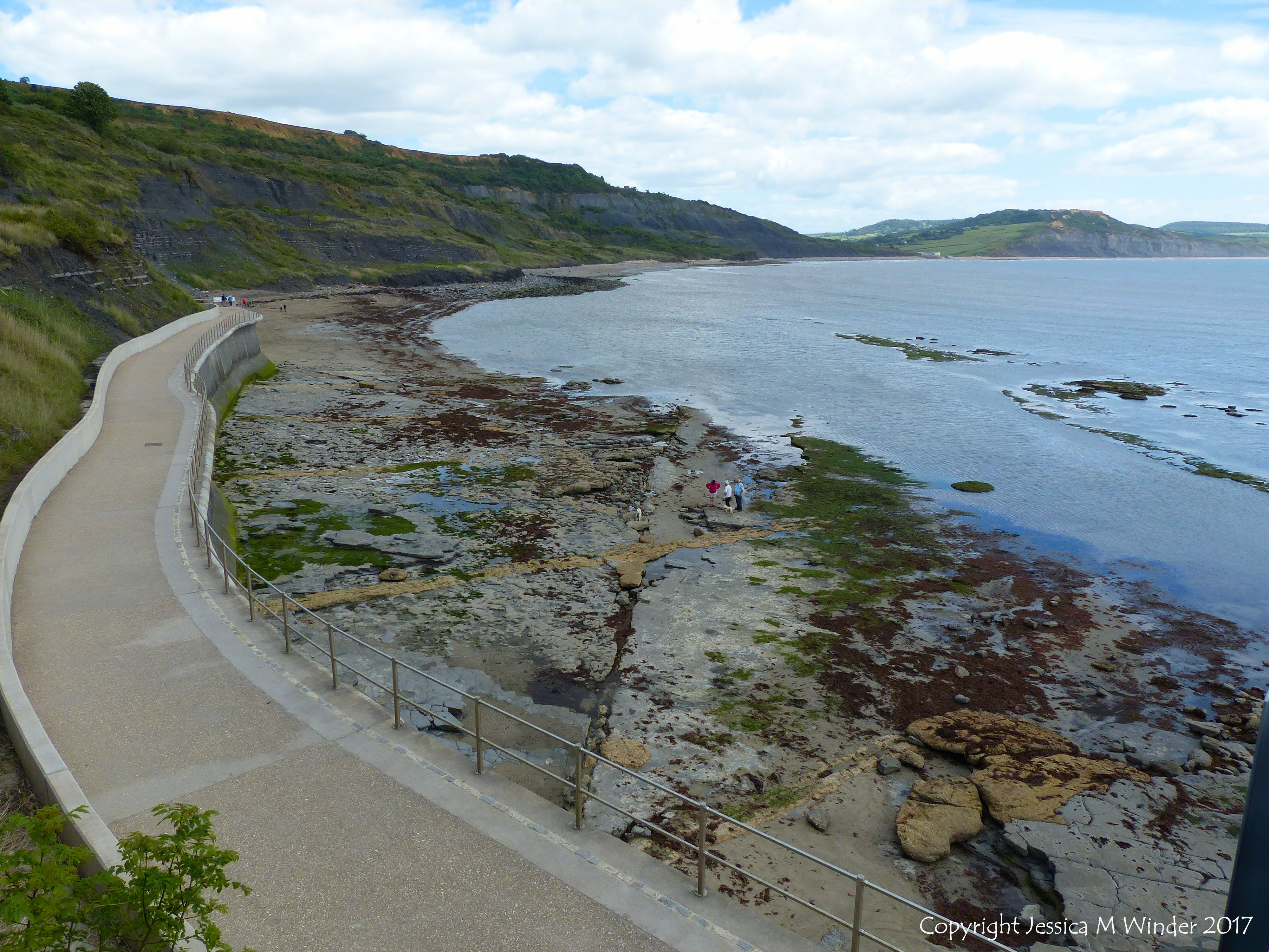 Below New Seawall LR 37 – View looking down on the rocky shore below the new sea wall walkway at Lyme Regis in Dorset, UK, in June 2017