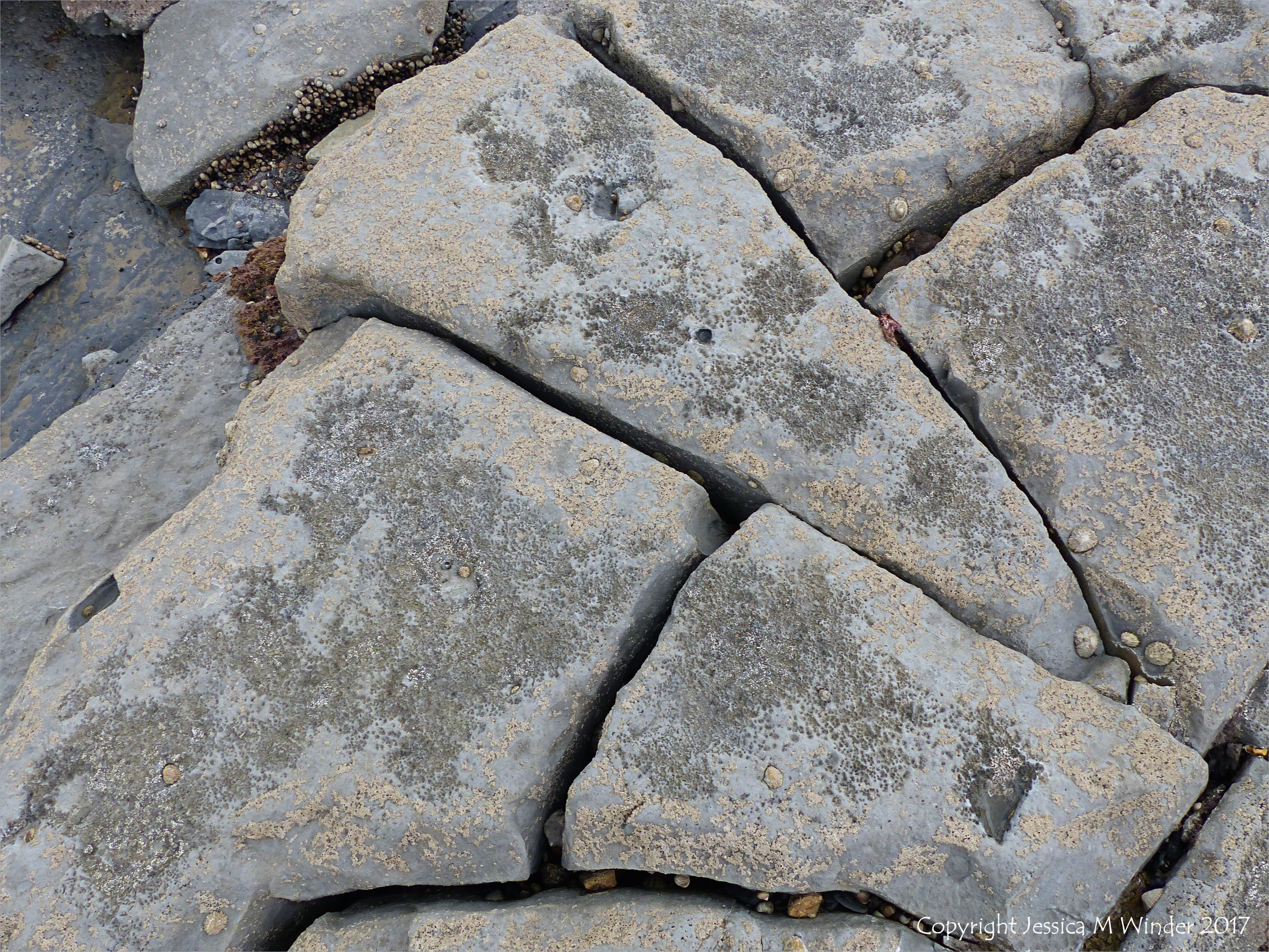 Below New Seawall LR 49 – Naturally fractured intertidal limestone pavement showing darker, damper patches where the burrows created by colonising by marine worms are gradually lowering the surface of the rock. The activity of limpets also contributes to the bio-erosion process. Photographed near Church Cliff in Lyme Regis, Dorset, England, June 2017.