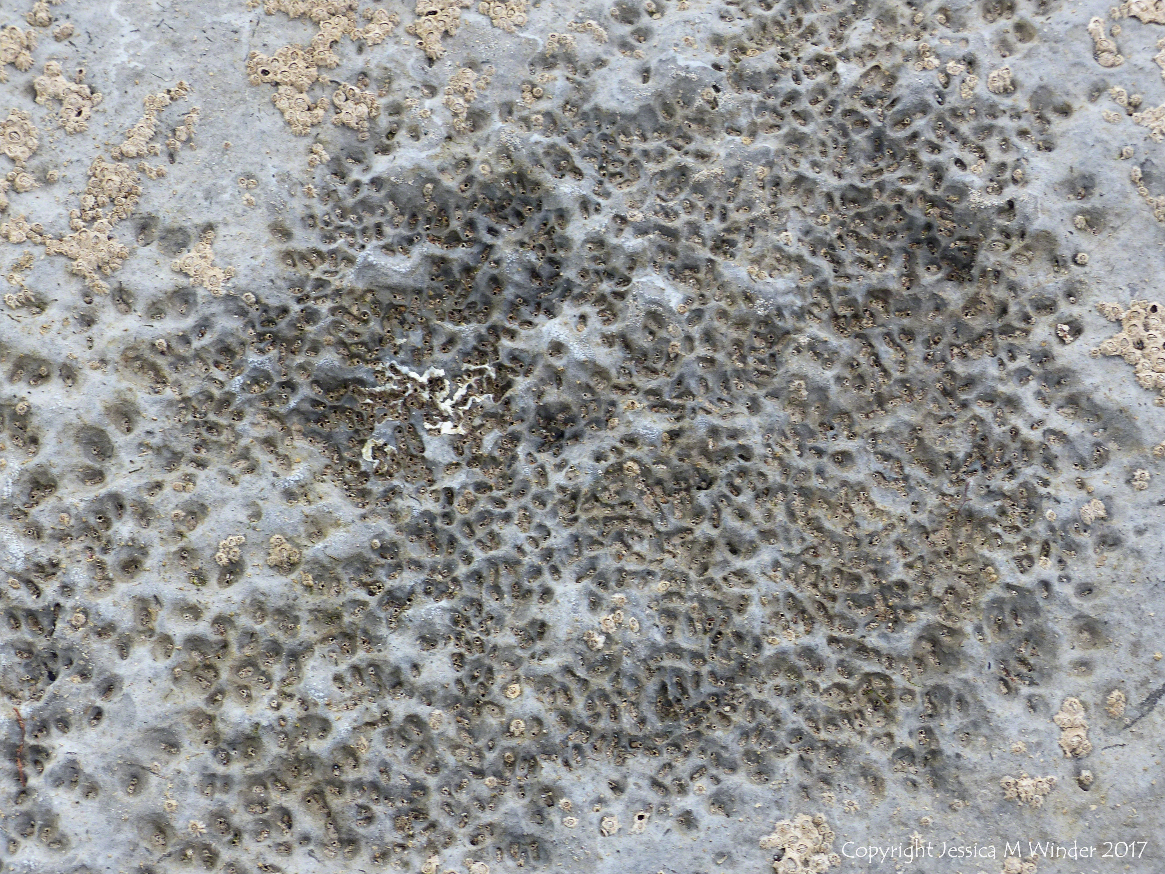 Below New Seawall LR 50 – Close-up of bio-erosion in limestone by burrowing marine worms such as the Polydora species on the shore below the new sea wall at Church Cliff in Lyme Regis, Dorset, England, June 2017.