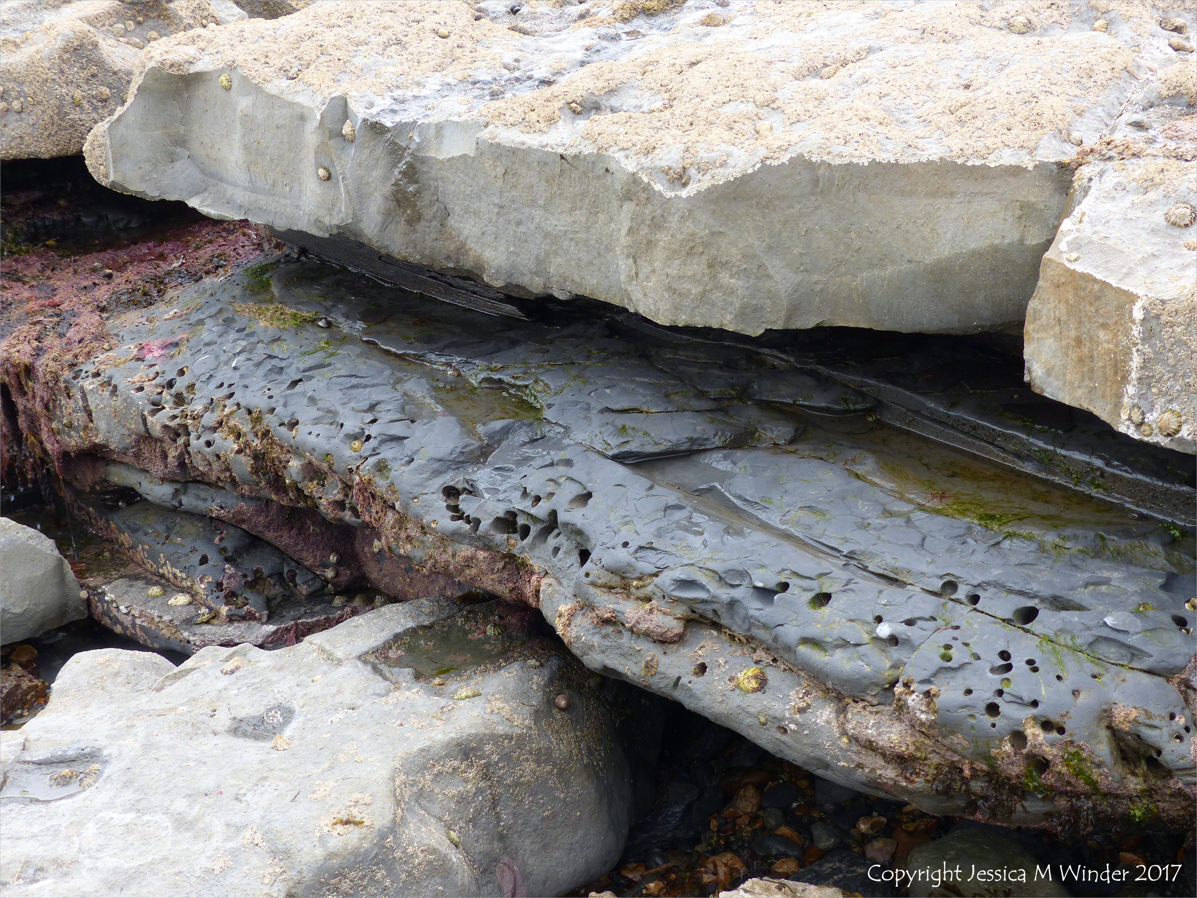 Below New Seawall LR 53 – Alternating layers of pale hard Lias limestone and softer dark mudstone that has holes made by bivalve molluscs such as piddocks, on the seashore below the new sea wall at Church Cliff in Lyme Regis, Dorset, UK, June 2017.