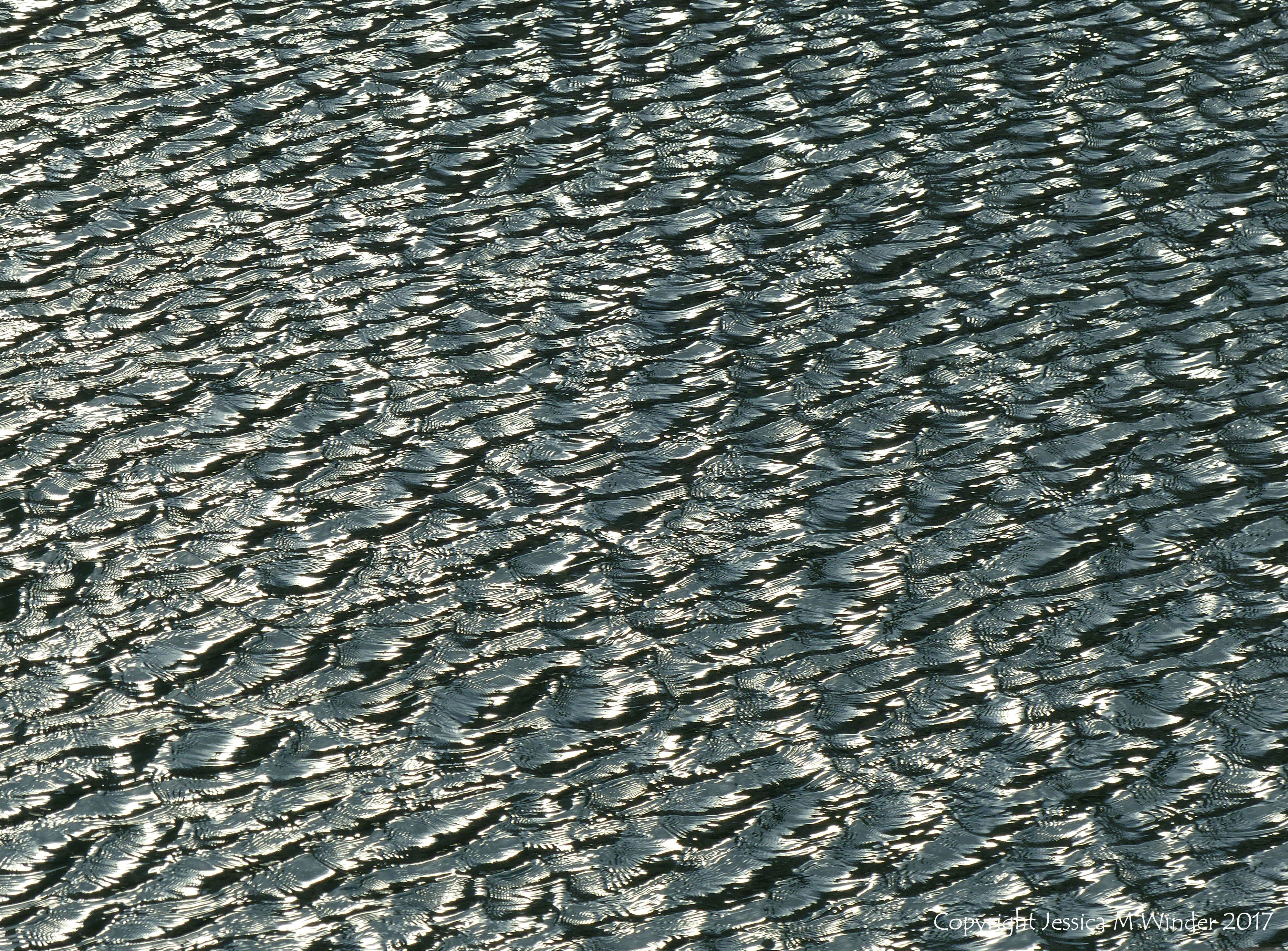 Surface Water Texture & Pattern (Barbican 1) – Natural pattern and texture on the surface of a stretch of pond ruffled by a strong breeze, and showing silvery reflections of a cloud-laden sky on scalloped water.
