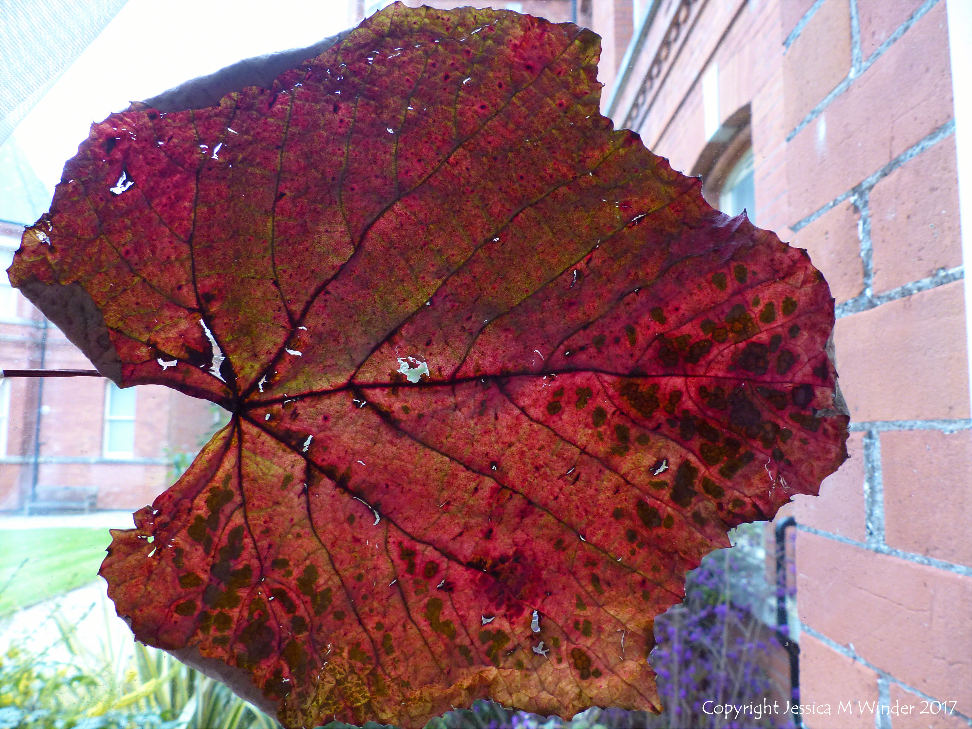 Dead Red Leaf 6 – Dead red autumn leaf held up against the window pane so that the daylight would shine through it and reveal the details of the structure and pattern.
