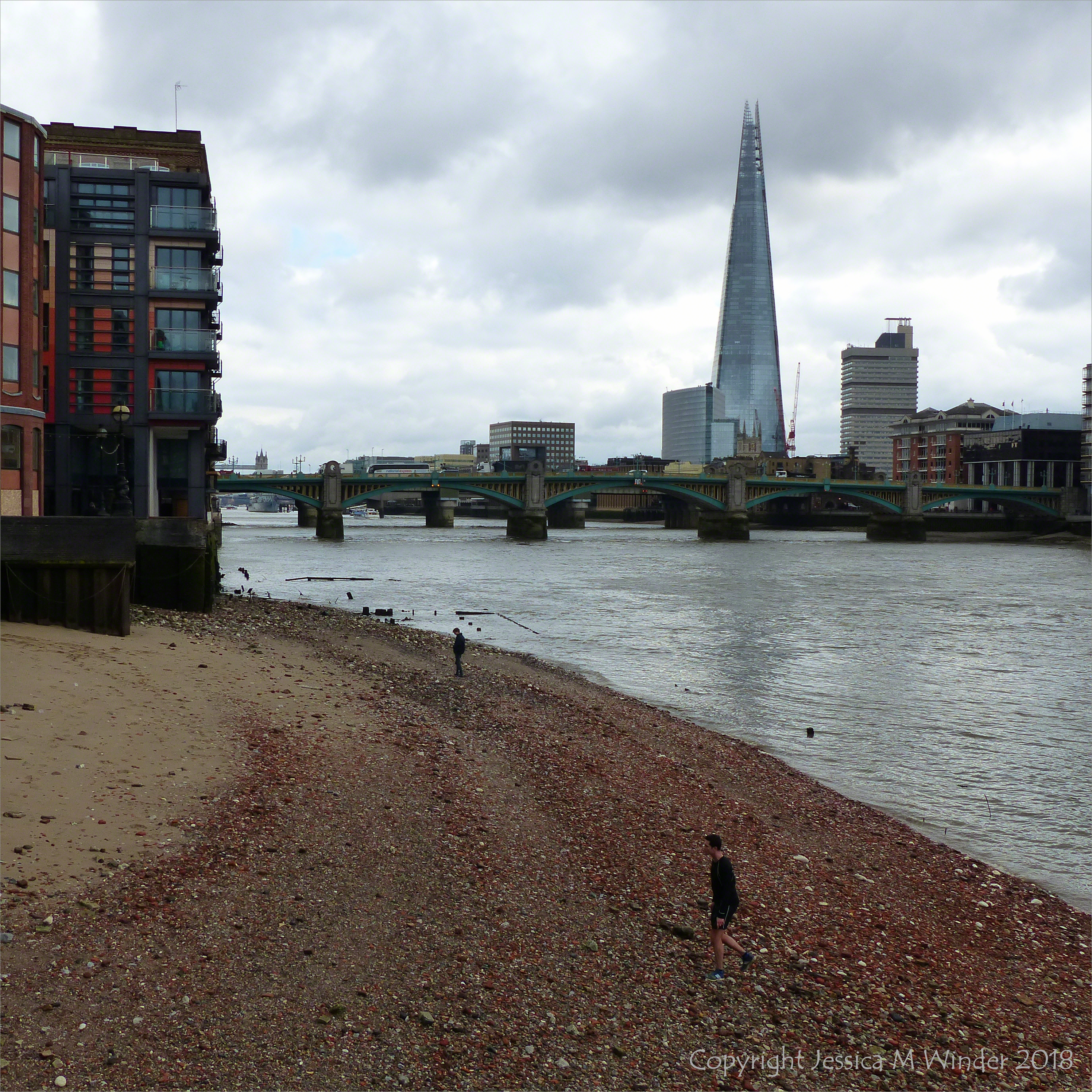 Urban Beach 1.1 – Urban beach on the north bank of the River Thames near the Millennium Bridge in London at low tide showing the red colour of the bricks and tiles of which it is mainly composed.