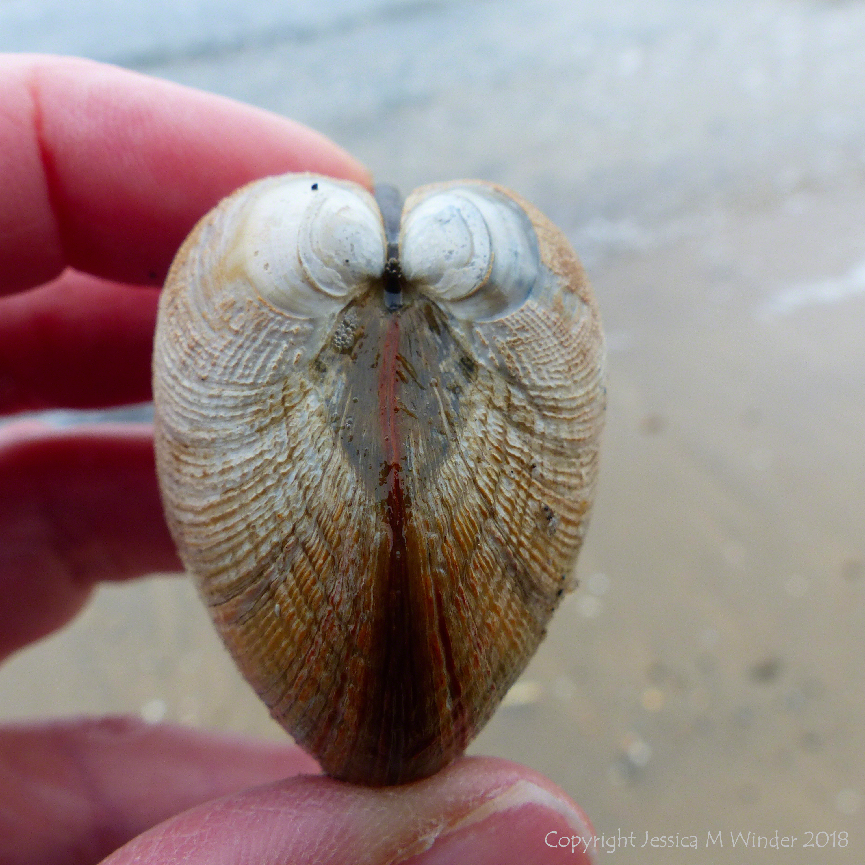 Studland Middle Beach 1 – Live clam washed ashore at Studland Middle Beach in Dorset, England, 18 February 2018.