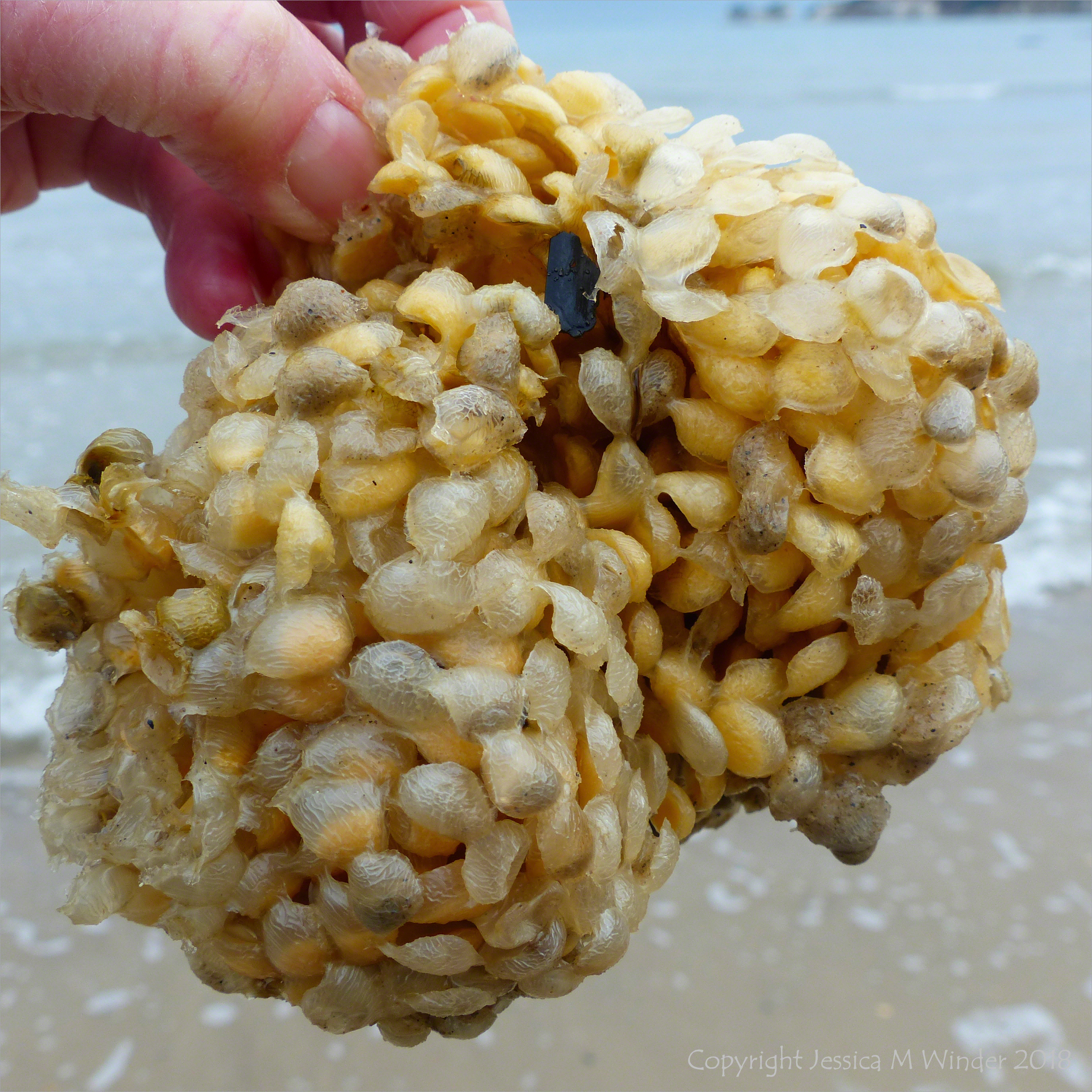 Studland Middle Beach 4 – Sea wash ball, cluster of egg cases made by the common whelk (Buccinum undatum) washed up at Studland Middle Beach in Dorset, England, 18 February 2018.