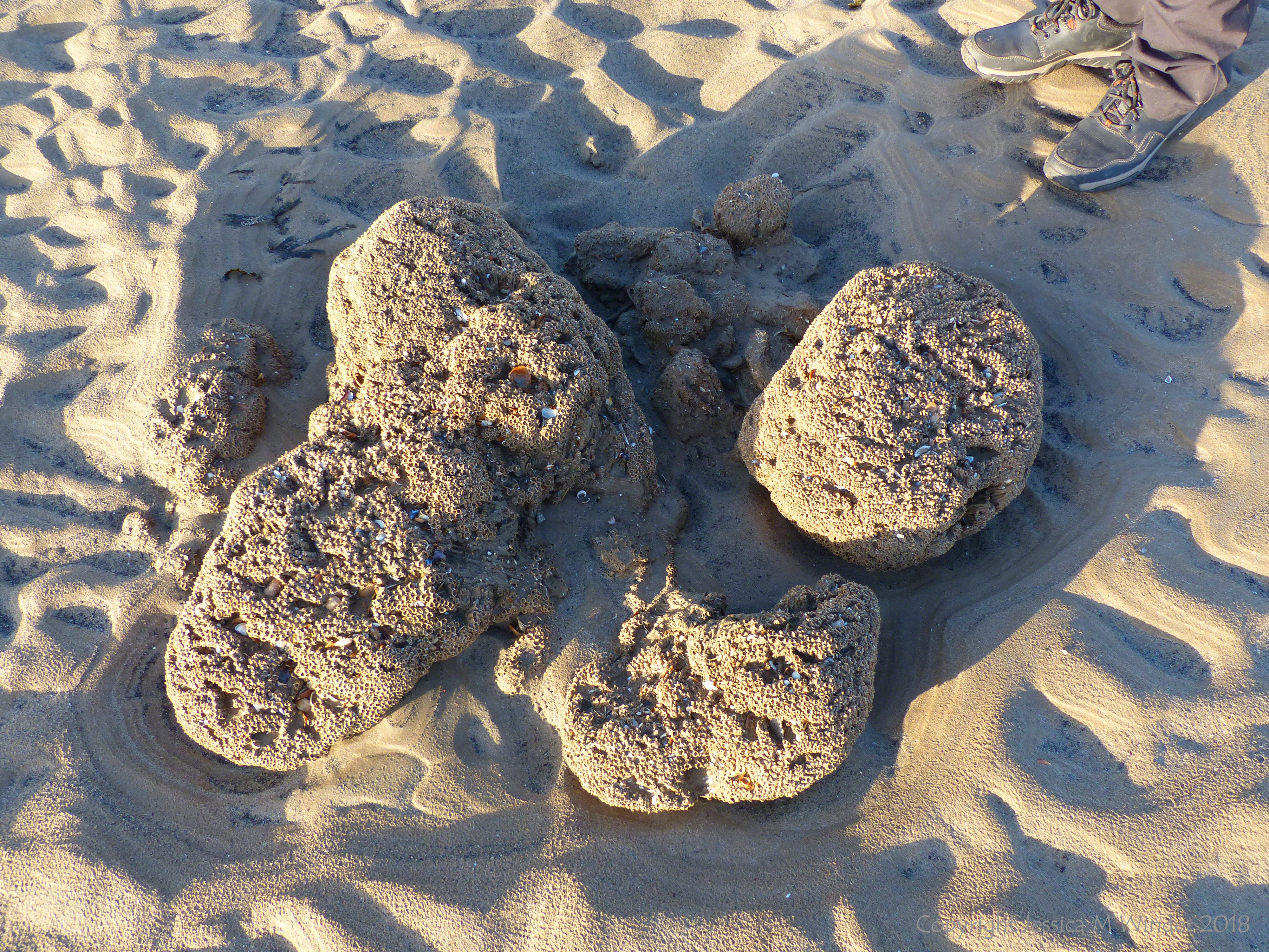 Swansea Bay Honeycomb Reefs 3 – Boulders with sand tubes made by the honeycomb worm (Sabellaria alveolata) at low tide in Swansea Bay 1st February 2018.