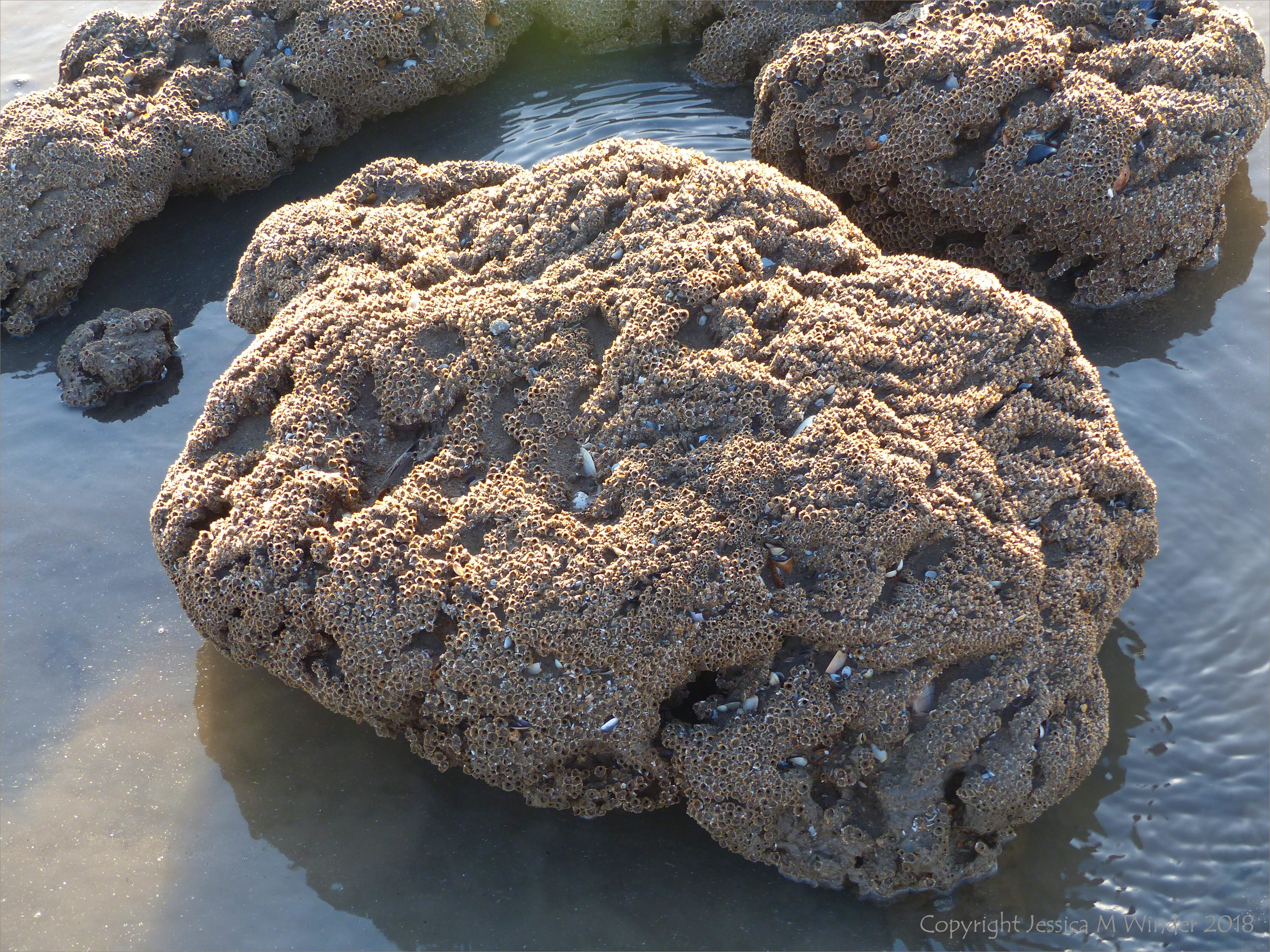 Swansea Bay Honeycomb Reefs 2 – Boulders with sand tubes made by the honeycomb worm (Sabellaria alveolata) at low tide in Swansea Bay 1st February 2018.