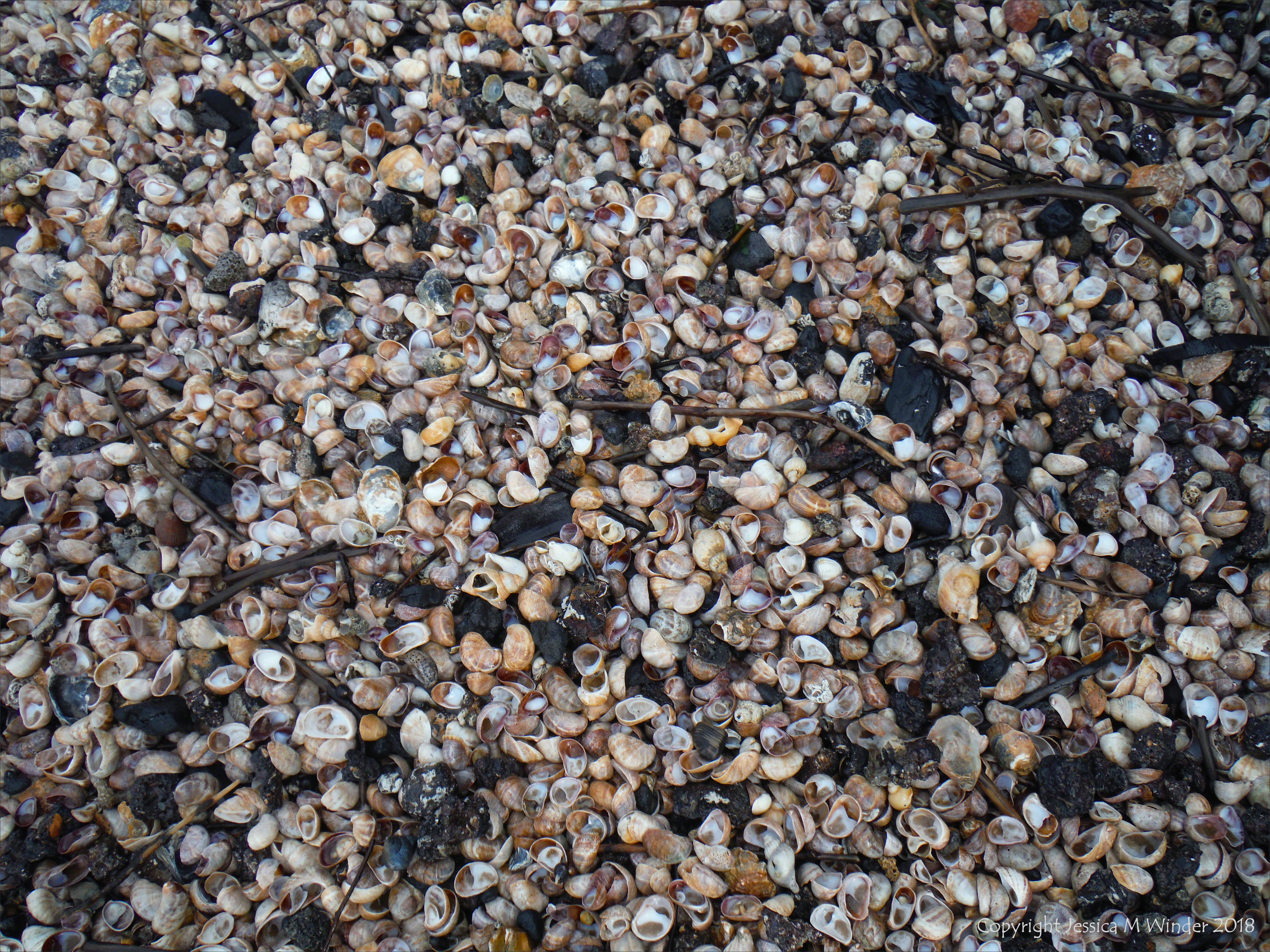 Slag & Seashells Swansea Bay 9 – Seashell drift with slag and clinker on the beach against the rusty ironwork of West Pier at Swansea Harbour