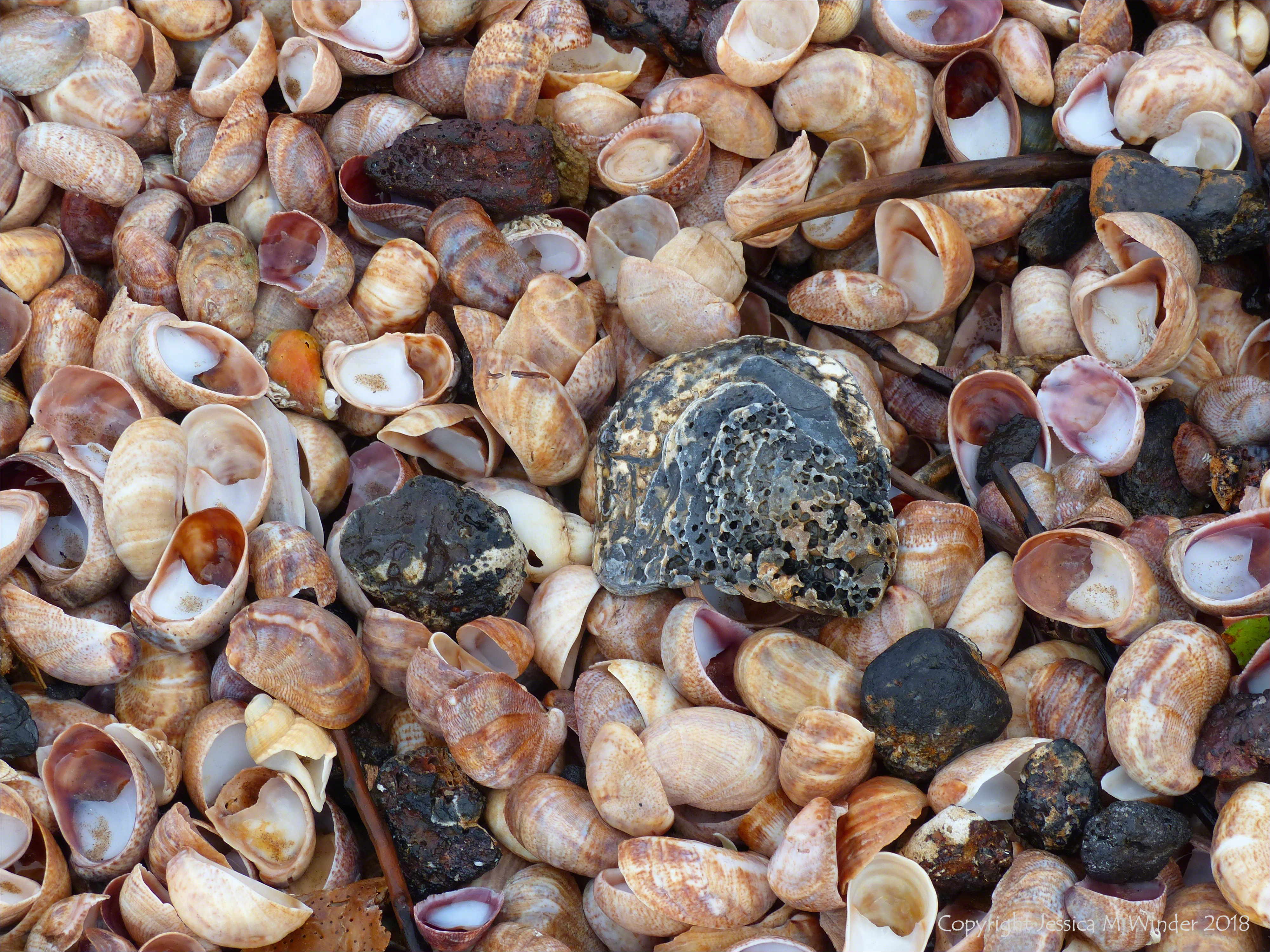 Slag & Seashells Swansea Bay 4 – Seashell drift with slag and clinker on the beach against the rusty ironwork of West Pier at Swansea Harbour