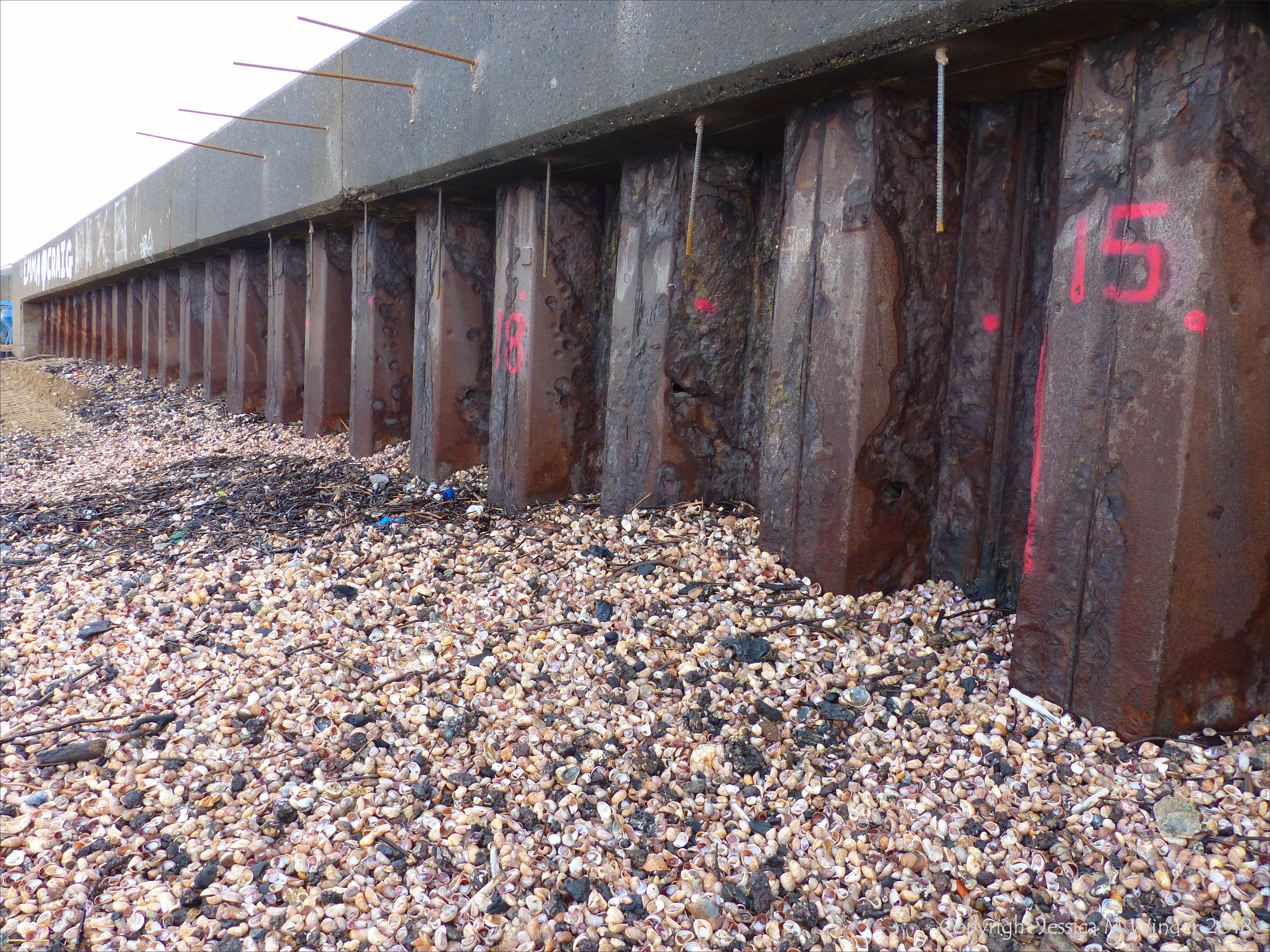Slag & Seashells Swansea Bay 5 – Seashell drift with slag and clinker on the beach against the rusty ironwork of West Pier at Swansea Harbour
