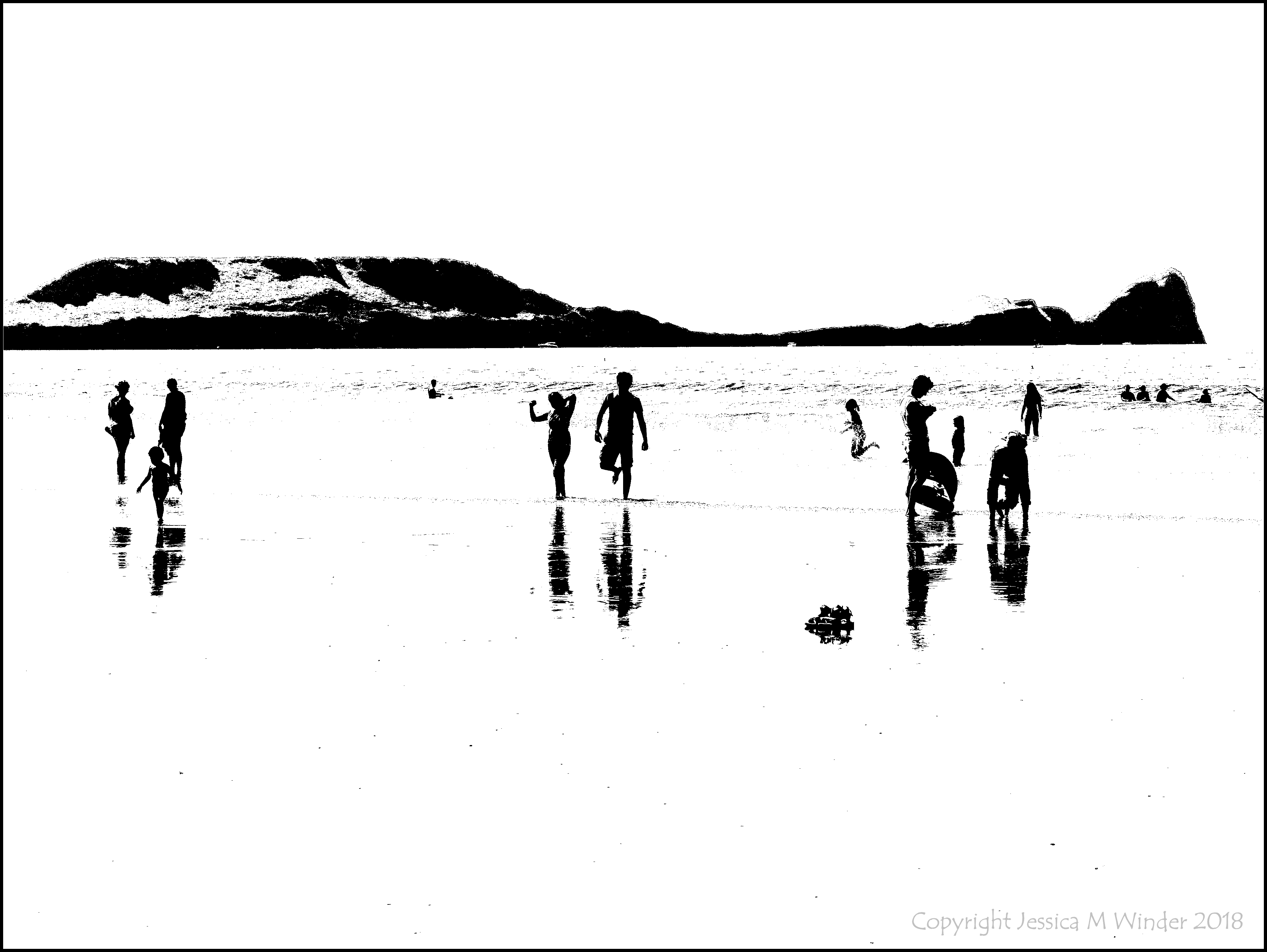 People at the Beach 12a – Black and white image of people on the water’s edge at the beach at Rhossili in Gower on a busy summer day, August 2017.