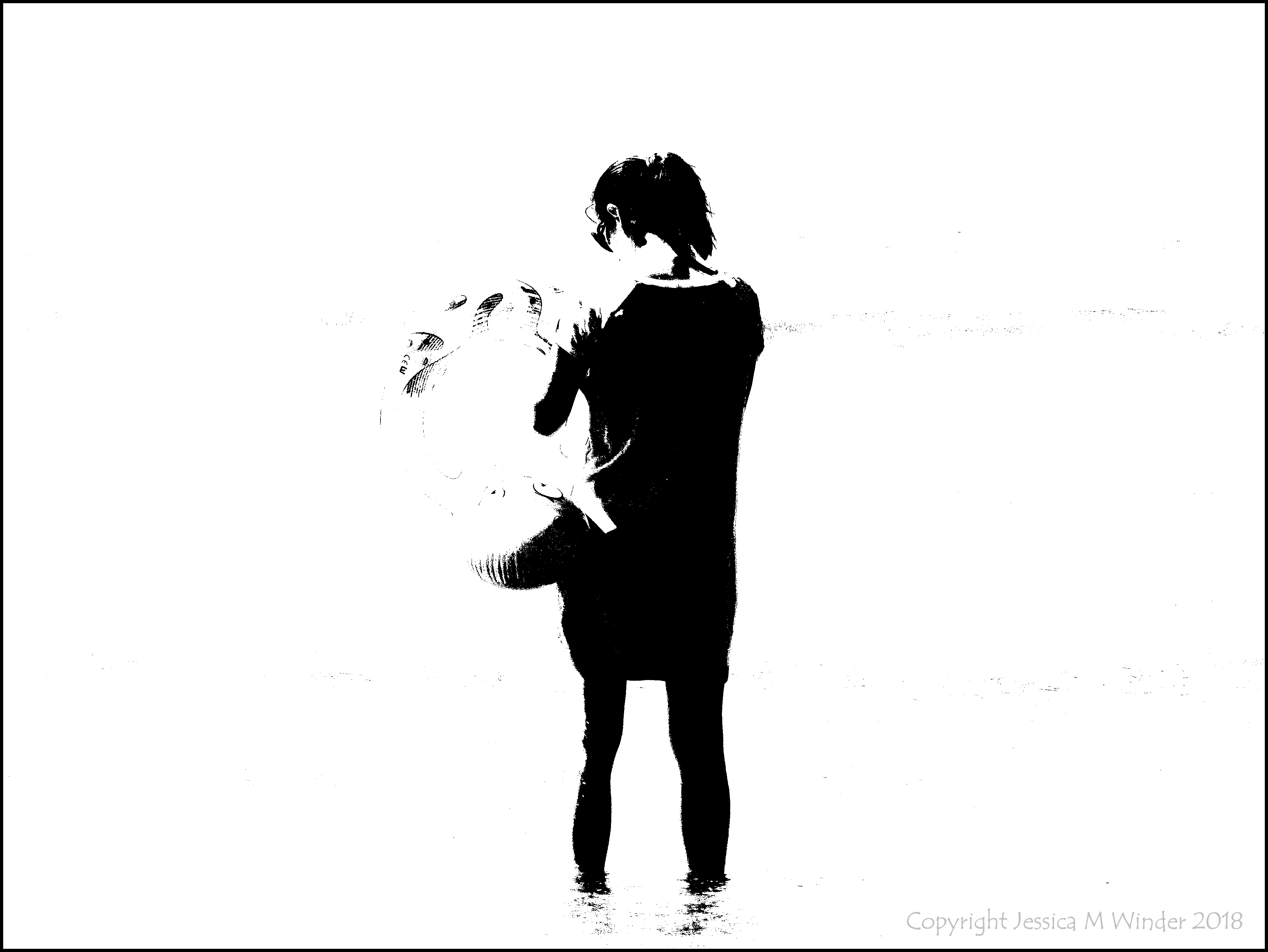 People at the Beach 15a – Black and white image of a woman holding an inflatable swim ring on the water’s edge on a summer day at Rhossili Beach in Gower, South Wales, August 2017.