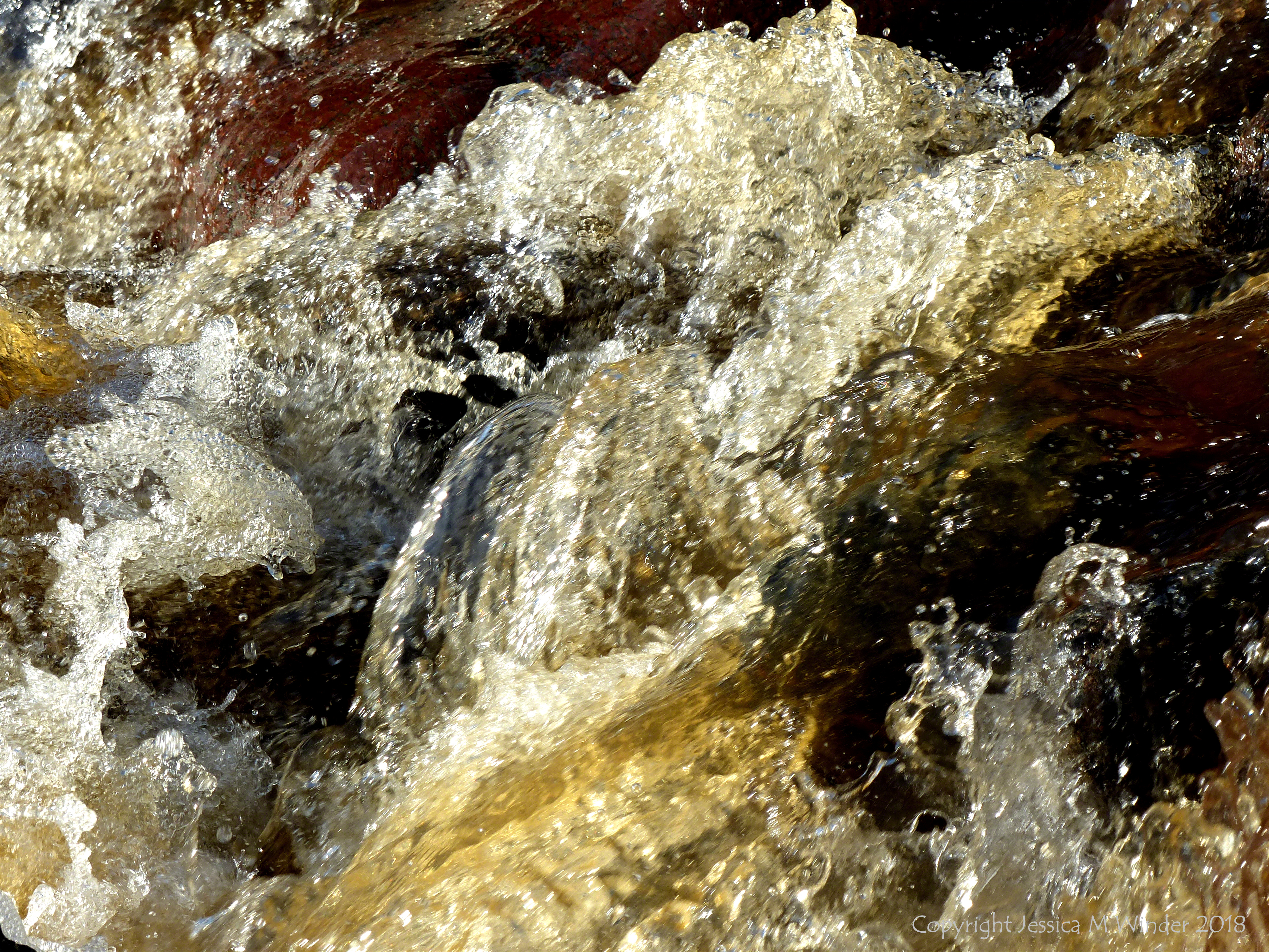Kynance Stream 8 – Close-up details of a torrent of brown water tumbling down a Cornish stream towards the shore at Kynance Cove on the Lizard Peninsula, December 2017.
