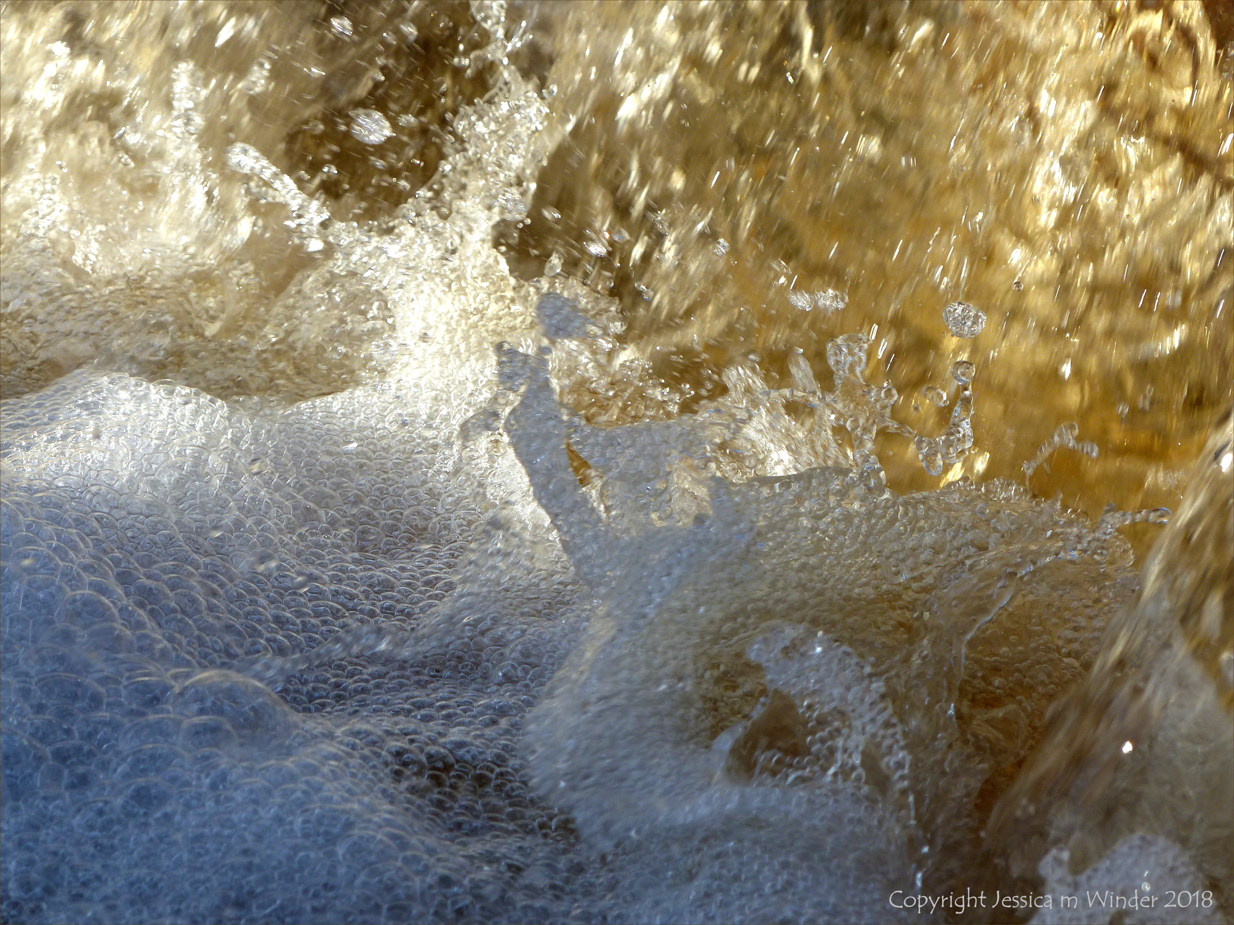 Kynance Stream 11 – Close-up details of a torrent of brown water tumbling down a Cornish stream towards the shore at Kynance Cove on the Lizard Peninsula, December 2017.