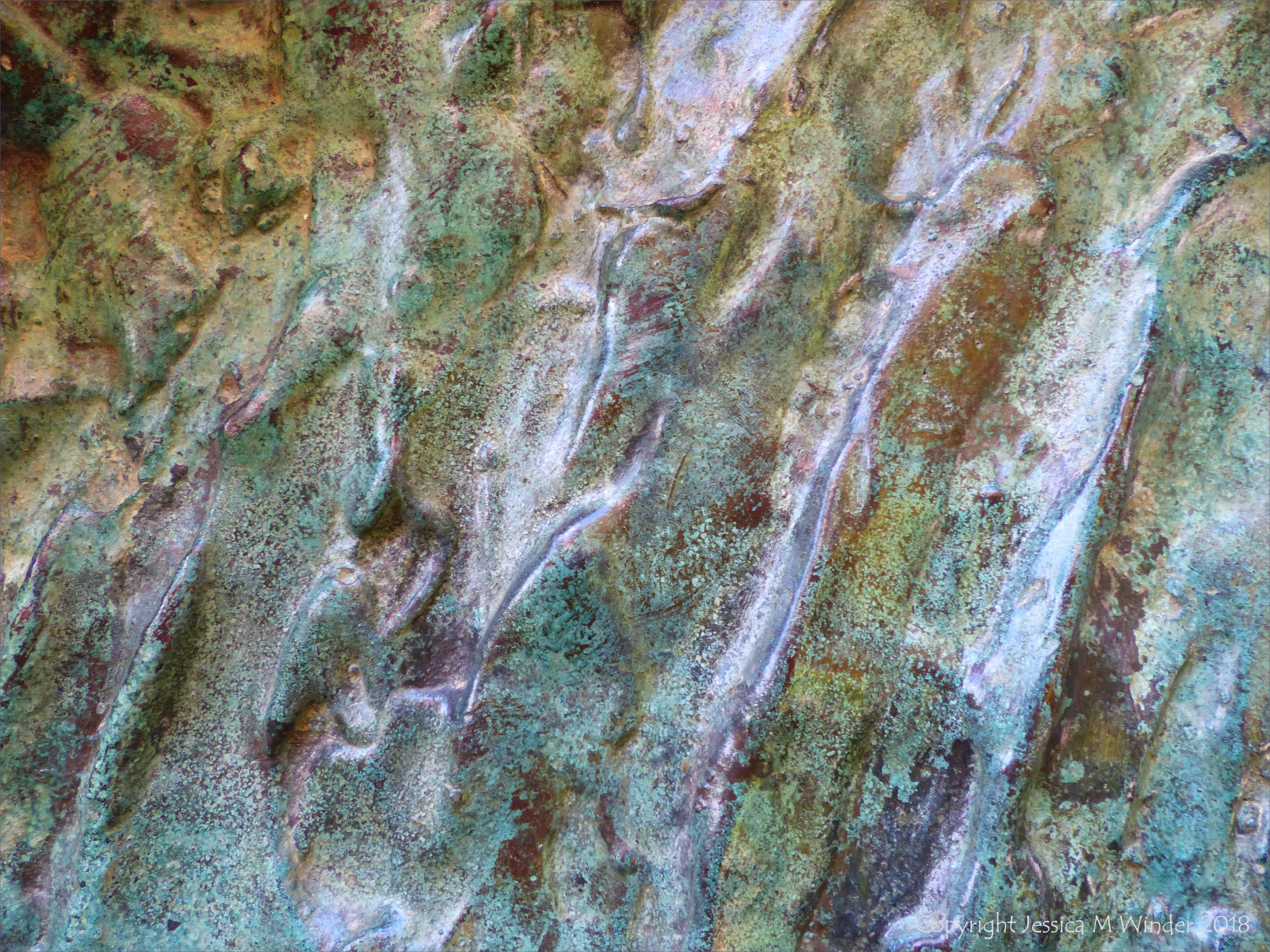 Barbara Hepworth Garden St Ives 3 – Detail of patination and texture on a bronze sculpture by Barbara Hepworth in the garden of her former home and studio in St Ives in Cornwall. The countryside, landscape and rocks influenced her work a great deal.