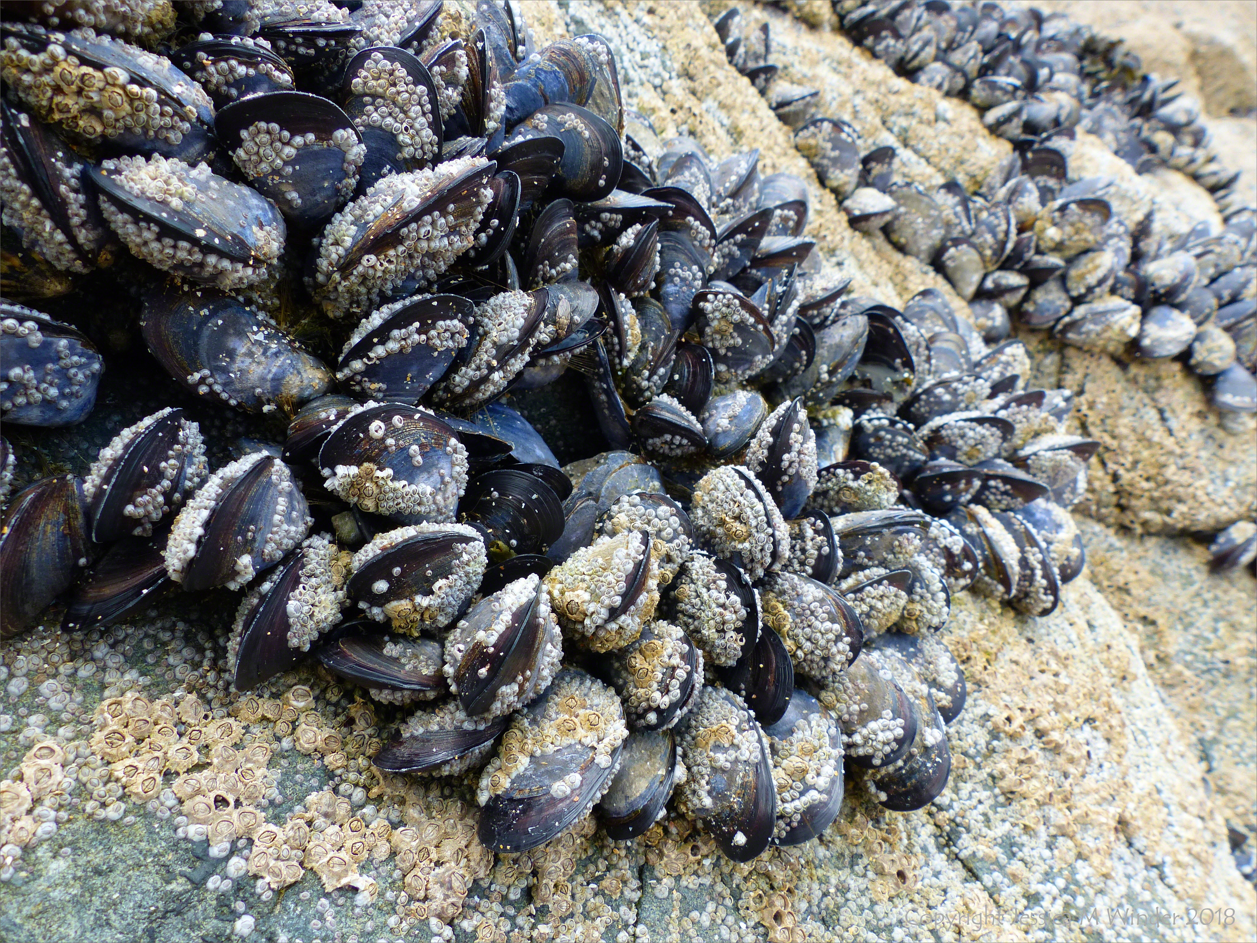 Porthgwidden Mussels & Barnacles 1 – Common edible mussels (Mytilus edulis) and acorn barnacles living on rocks at the seaside