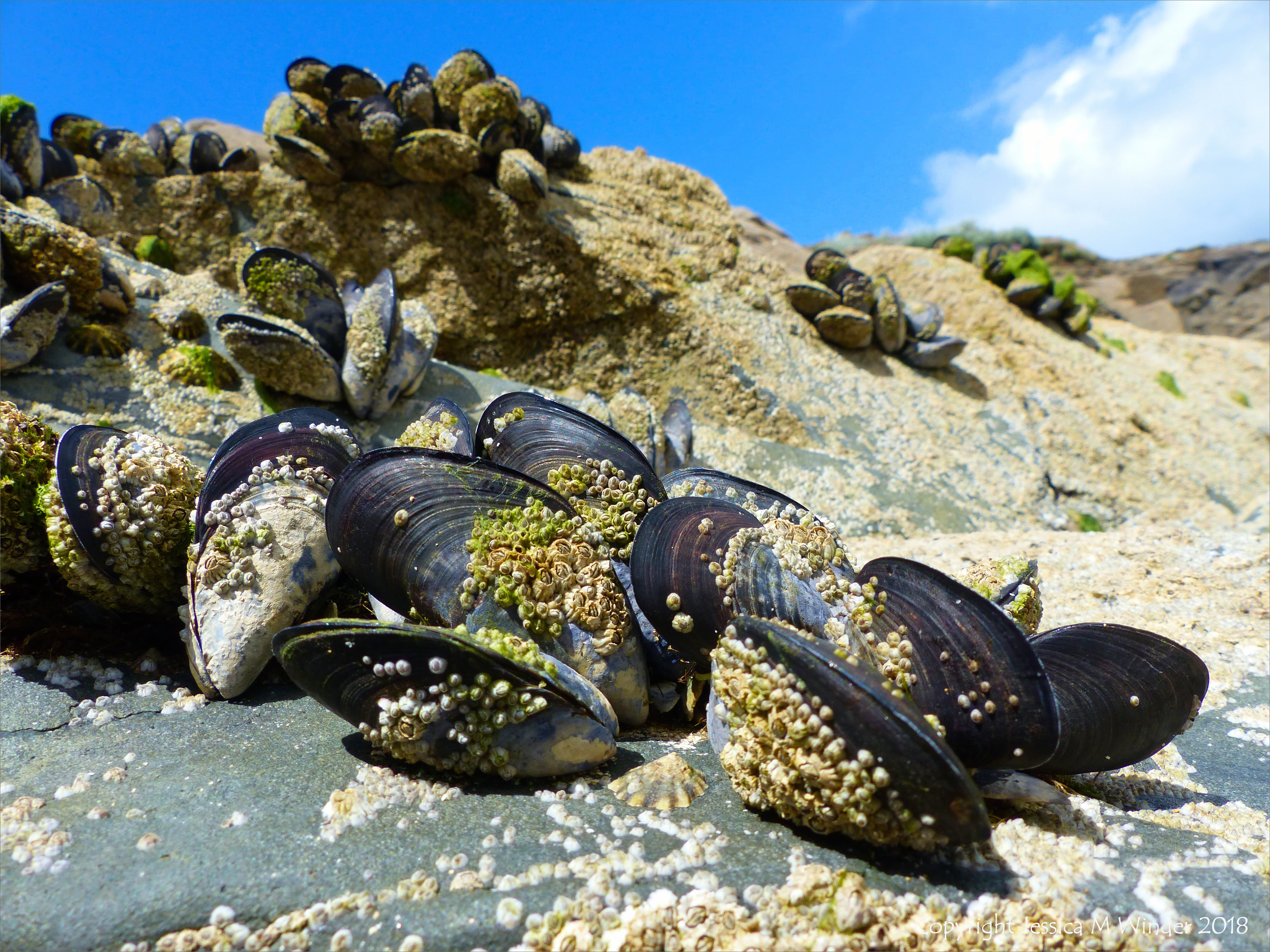Porthgwidden Mussels & Barnacles 3 – Common edible mussels (Mytilus edulis) and acorn barnacles living on rocks at the seaside