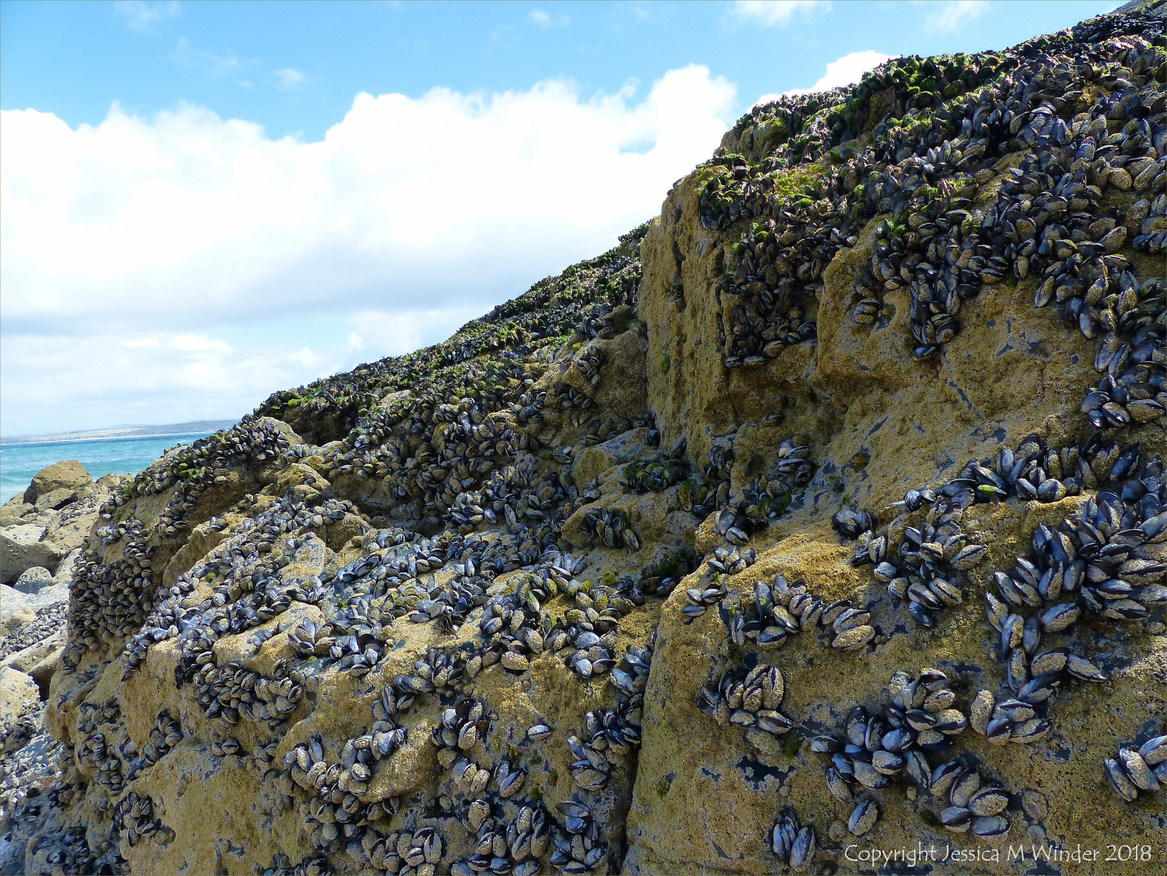 Porthgwidden Mussels & Barnacles 9 – Common edible mussels (Mytilus edulis) and acorn barnacles living on rocks at the seaside
