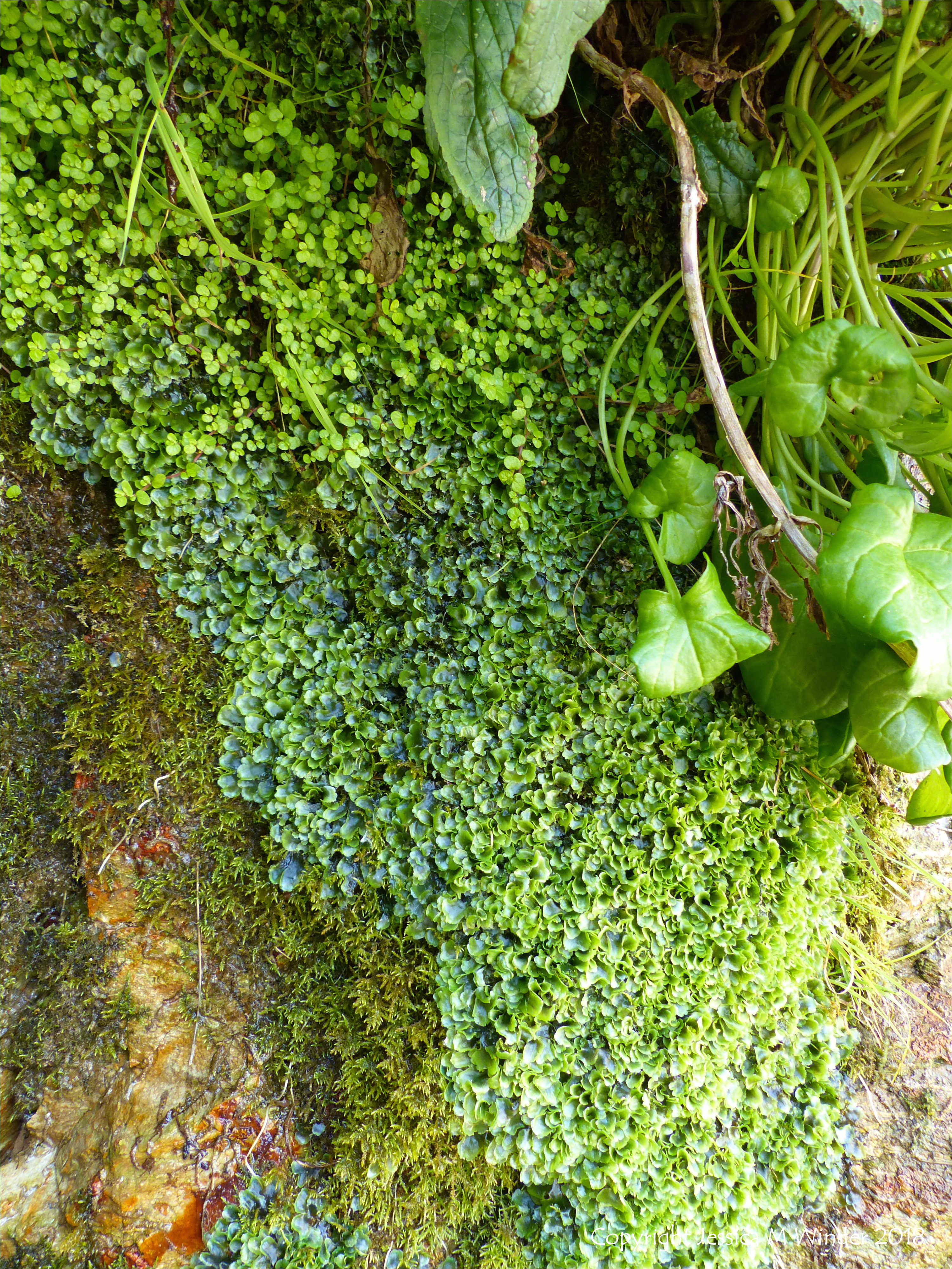 Carbis Bay (Plant) 11 – Liverworts with a bit of moss growing on rocks around a Wheal Providence mine adit (horizontal access and drainage tunnel) in the cliffs at Carbis Bay near St Ives in Cornwall May 2015