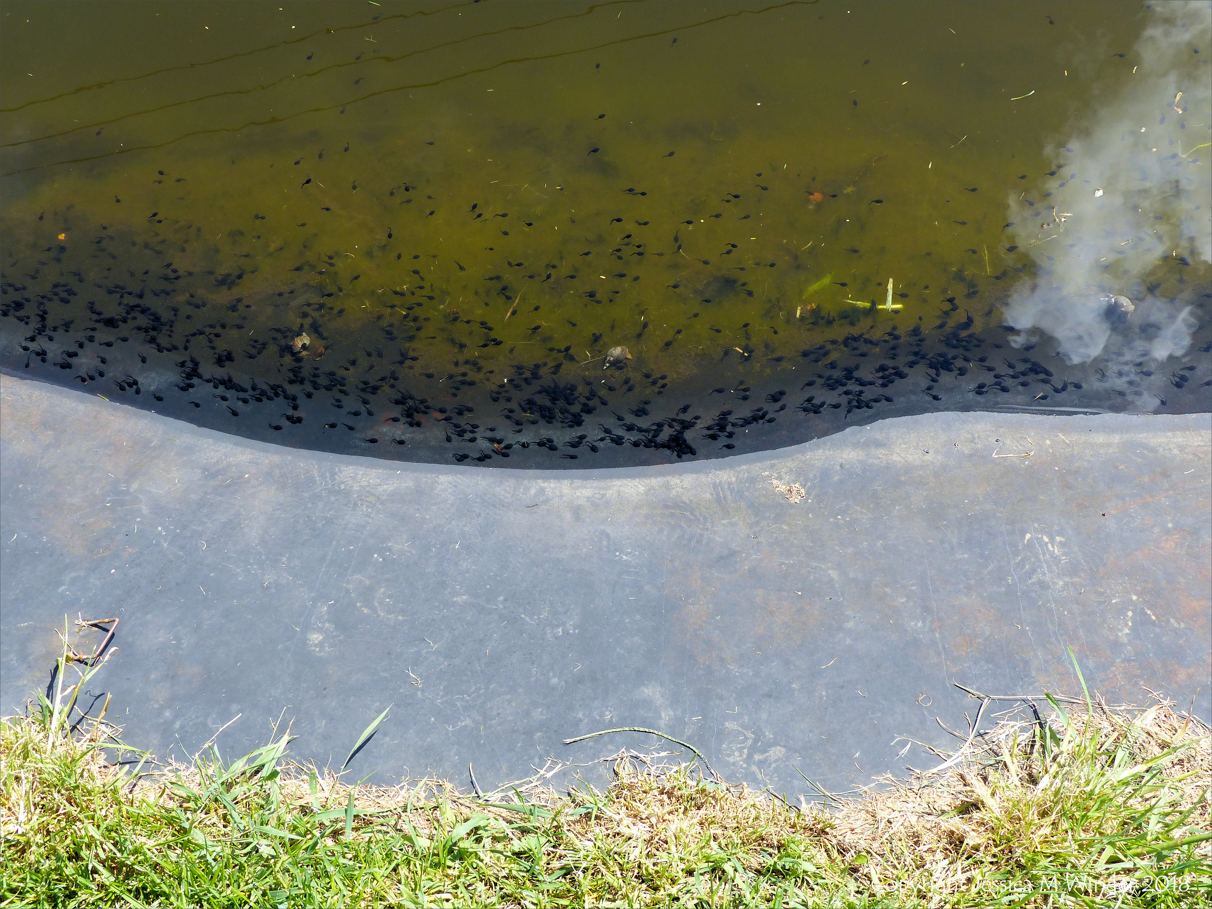 Toadpoles 2 – Tadpoles that will grow into toads eating the biofilm on the edge of the pond liner of the village pond at the nature reserve, Charlton Down May 2018