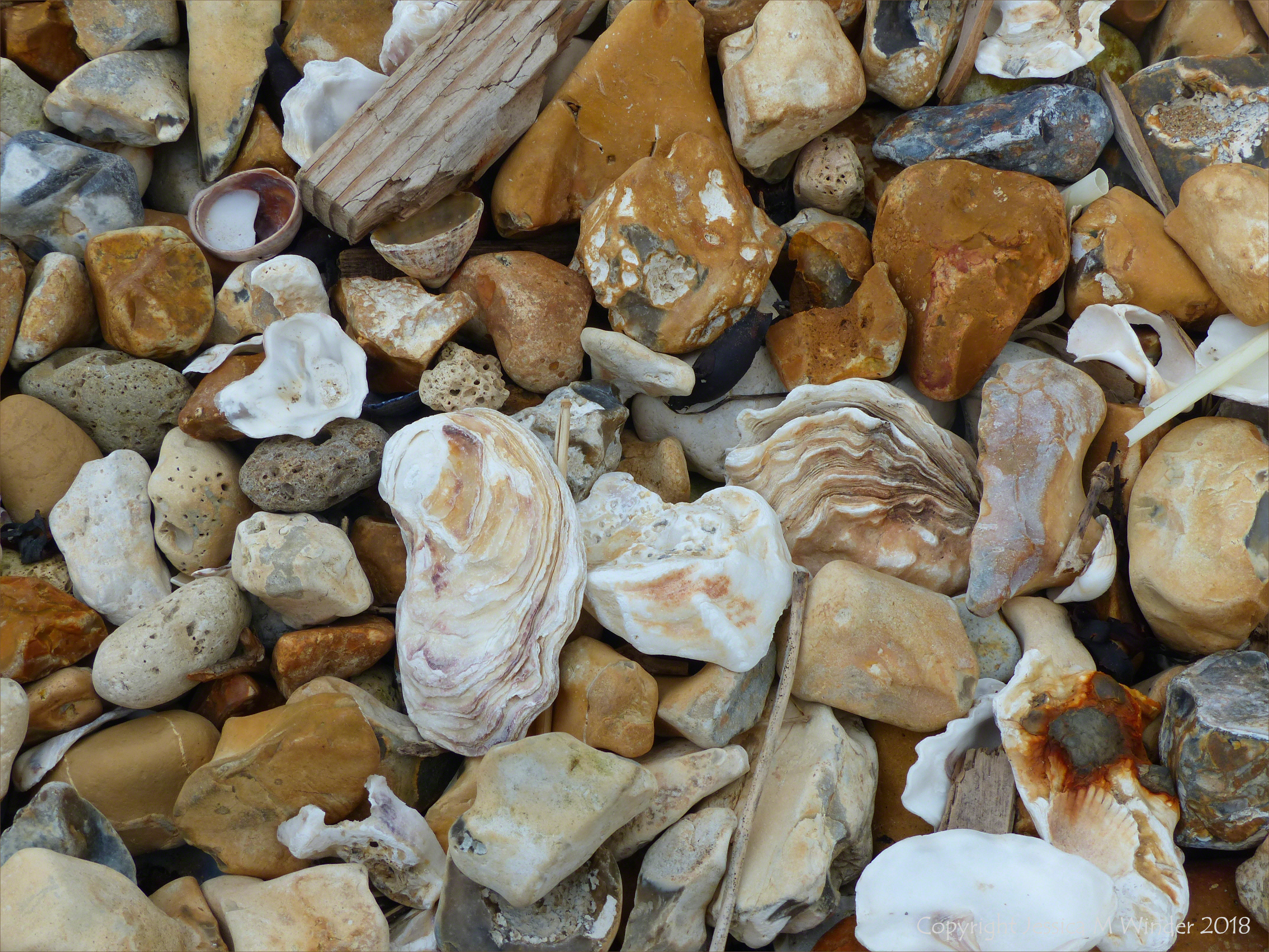 Beach Stone Holes Whitstable 2 – Beach stones with natural holes, made by various marine invertebrates and natural processes, mixed in with the pebbles and shells on the shingle shore at Whitstable in Kent.
