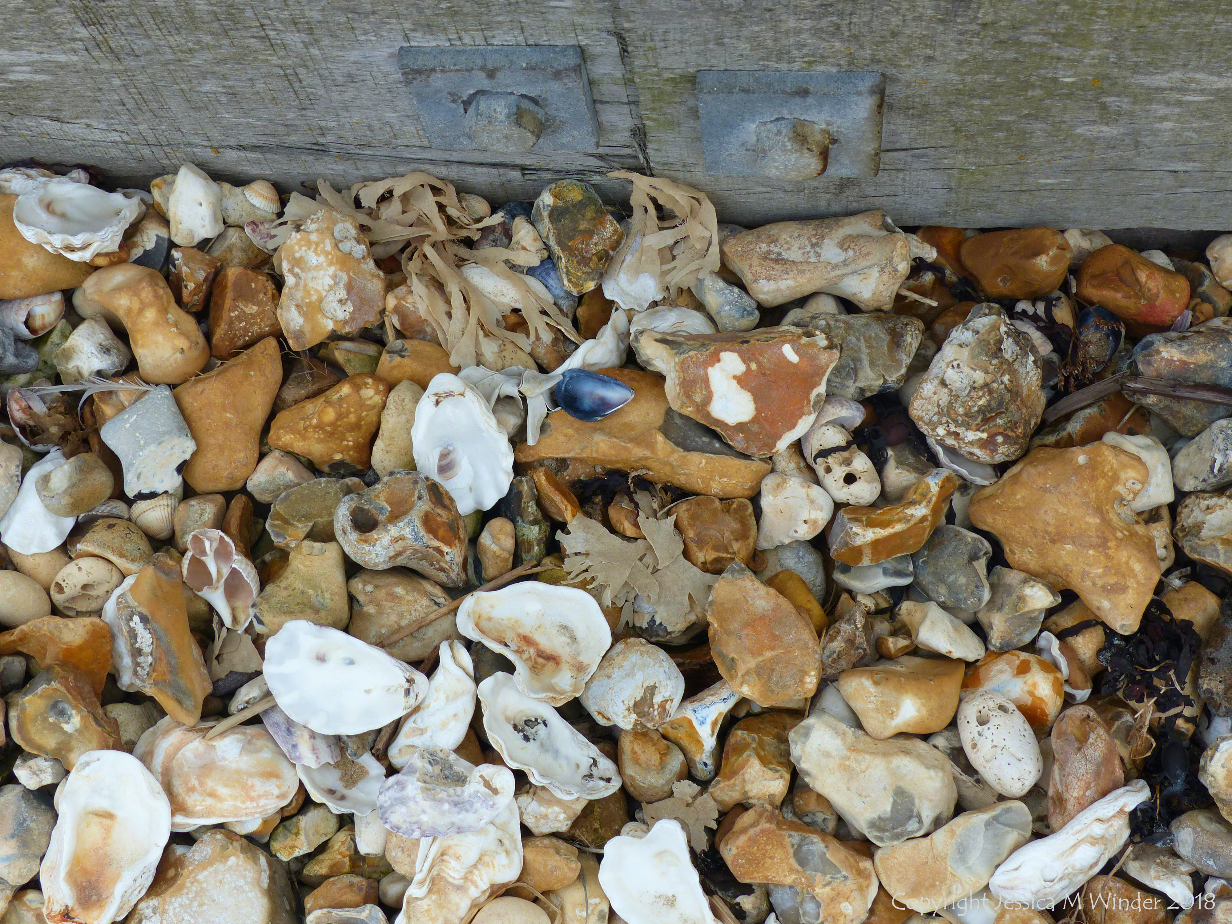 Beach Stone Holes Whitstable 4 – Beach stones with natural holes, made by various marine invertebrates and natural processes, mixed in with the pebbles and shells on the shingle shore at Whitstable in Kent.