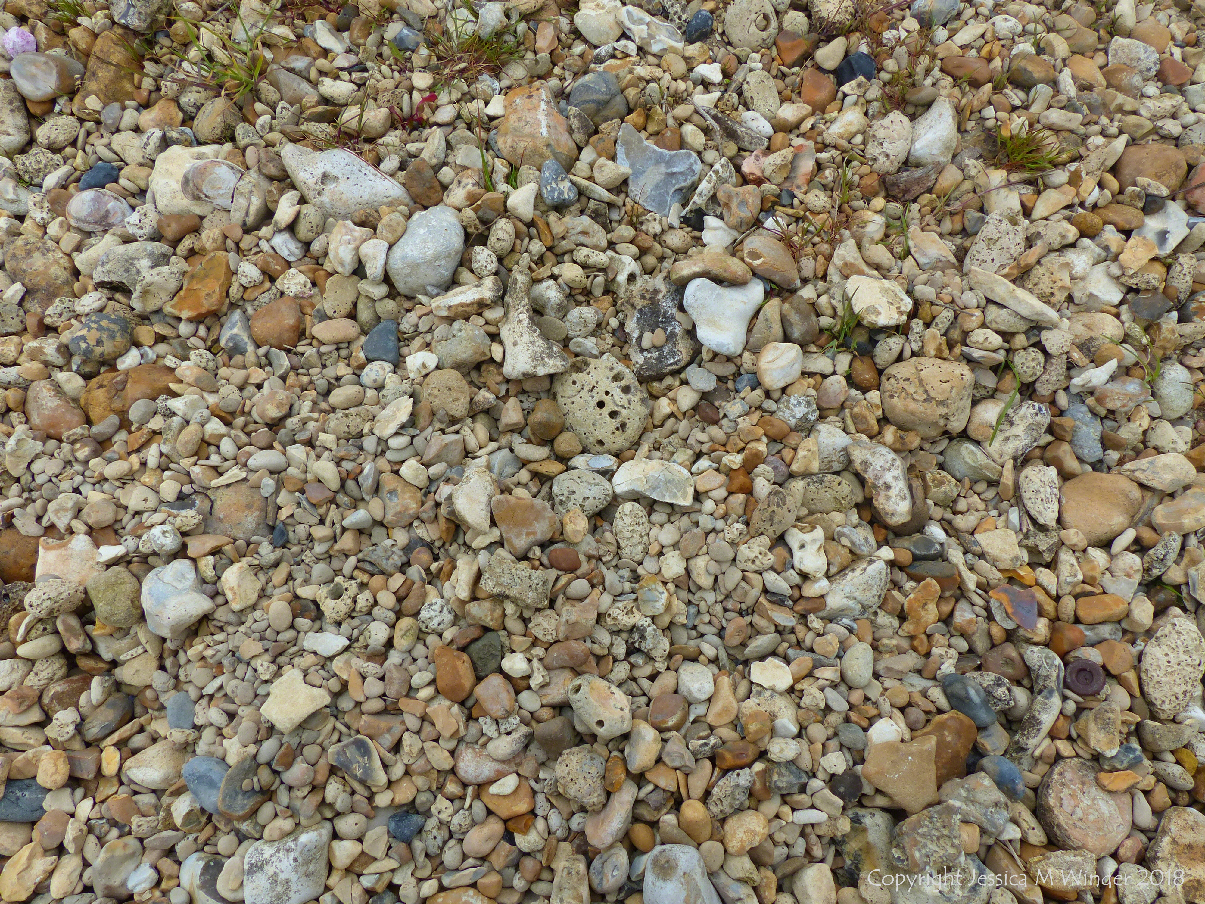Beach Stone Holes Whitstable 7 – Beach stones with natural holes, made by various marine invertebrates and natural processes, mixed in with the pebbles and shells on the shingle shore at Whitstable in Kent.