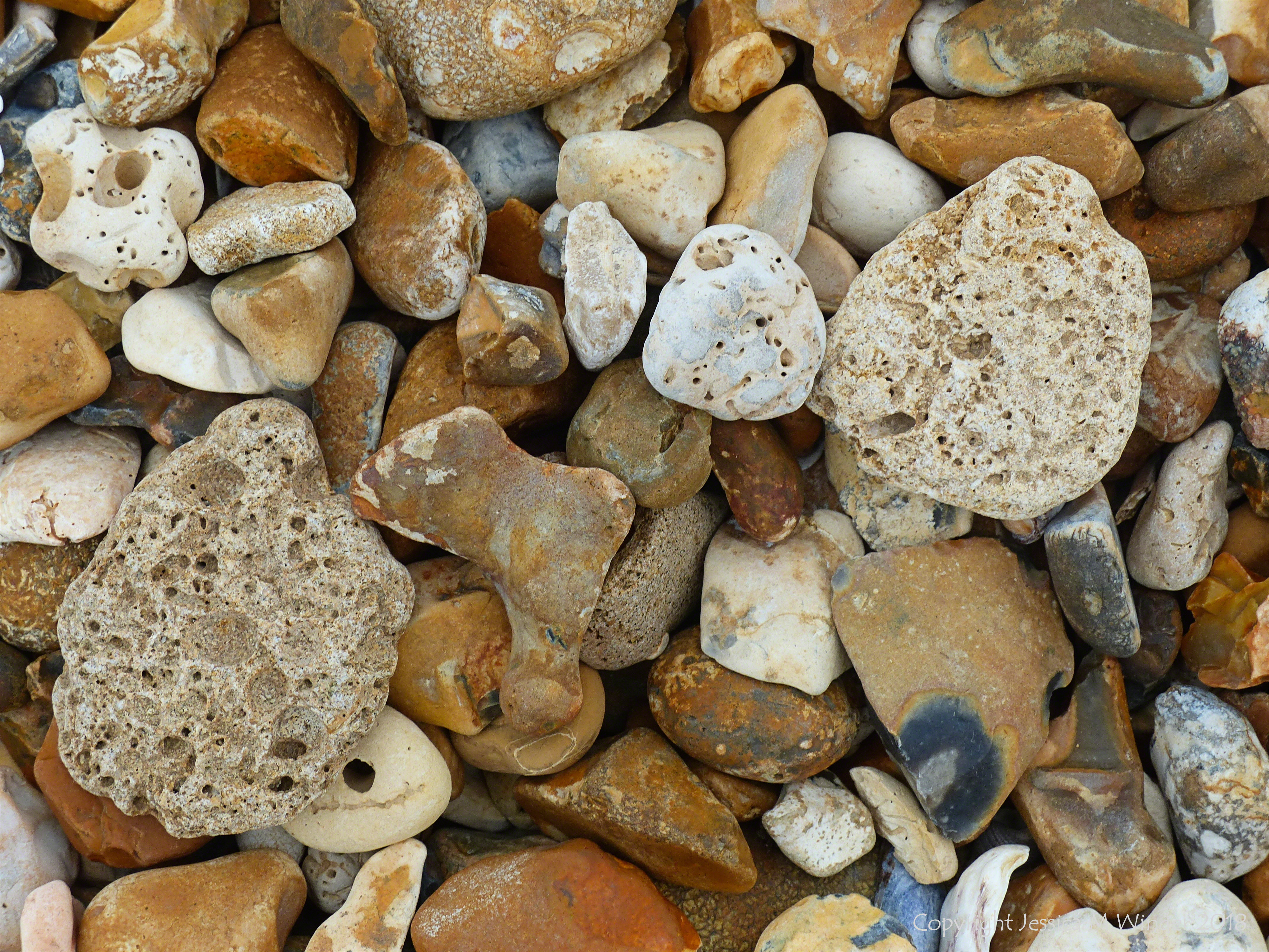 Beach Stone Holes Whitstable 10 – Beach stones with natural holes, made by various marine invertebrates and natural processes, mixed in with the pebbles and shells on the shingle shore at Whitstable in Kent.