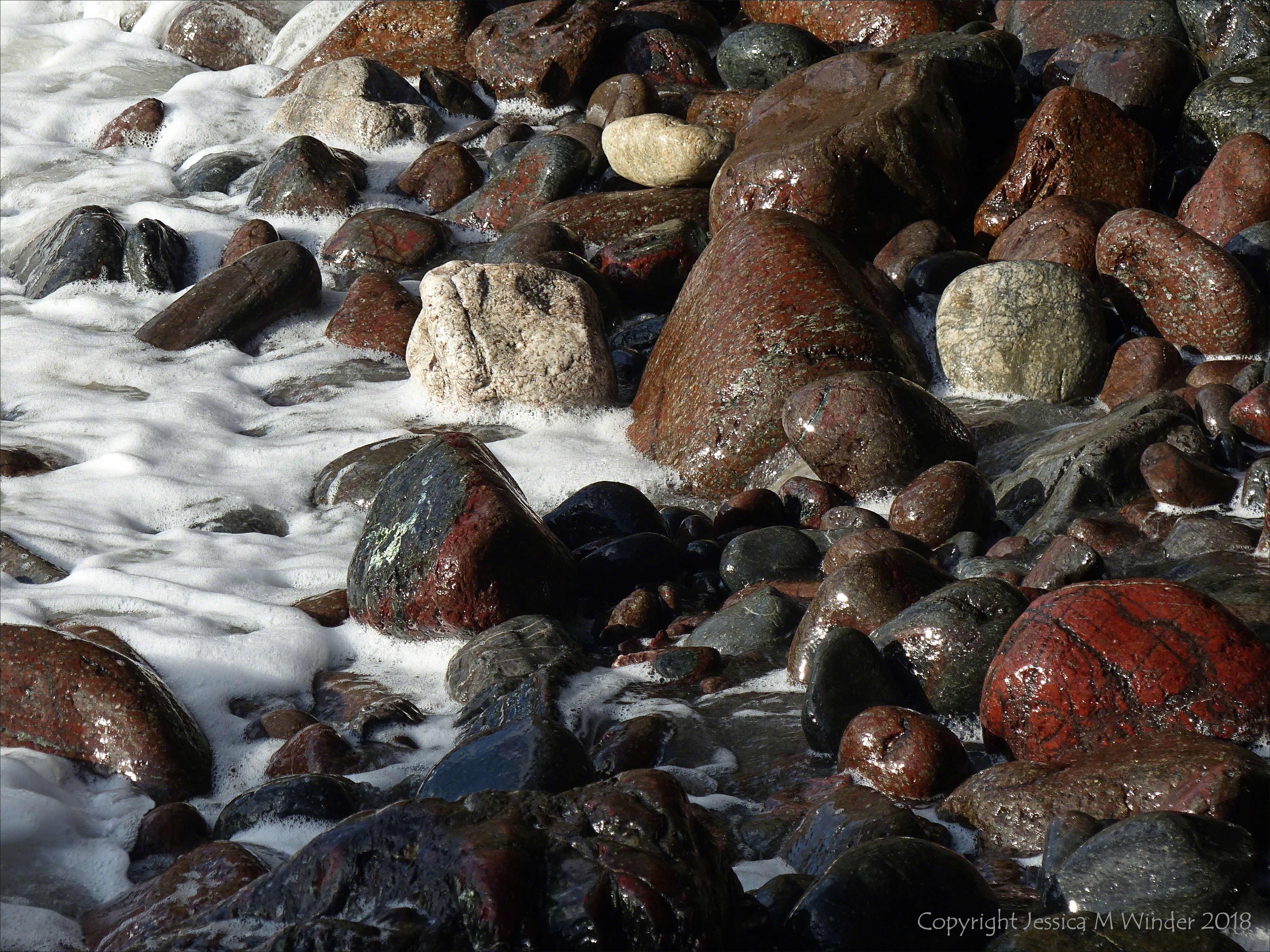 Kynance Pebbles 5 Kynance Pebbles 5 – Mostly serpentine pebbles with white sea-foam at Kynance Cove in Cornwall, England