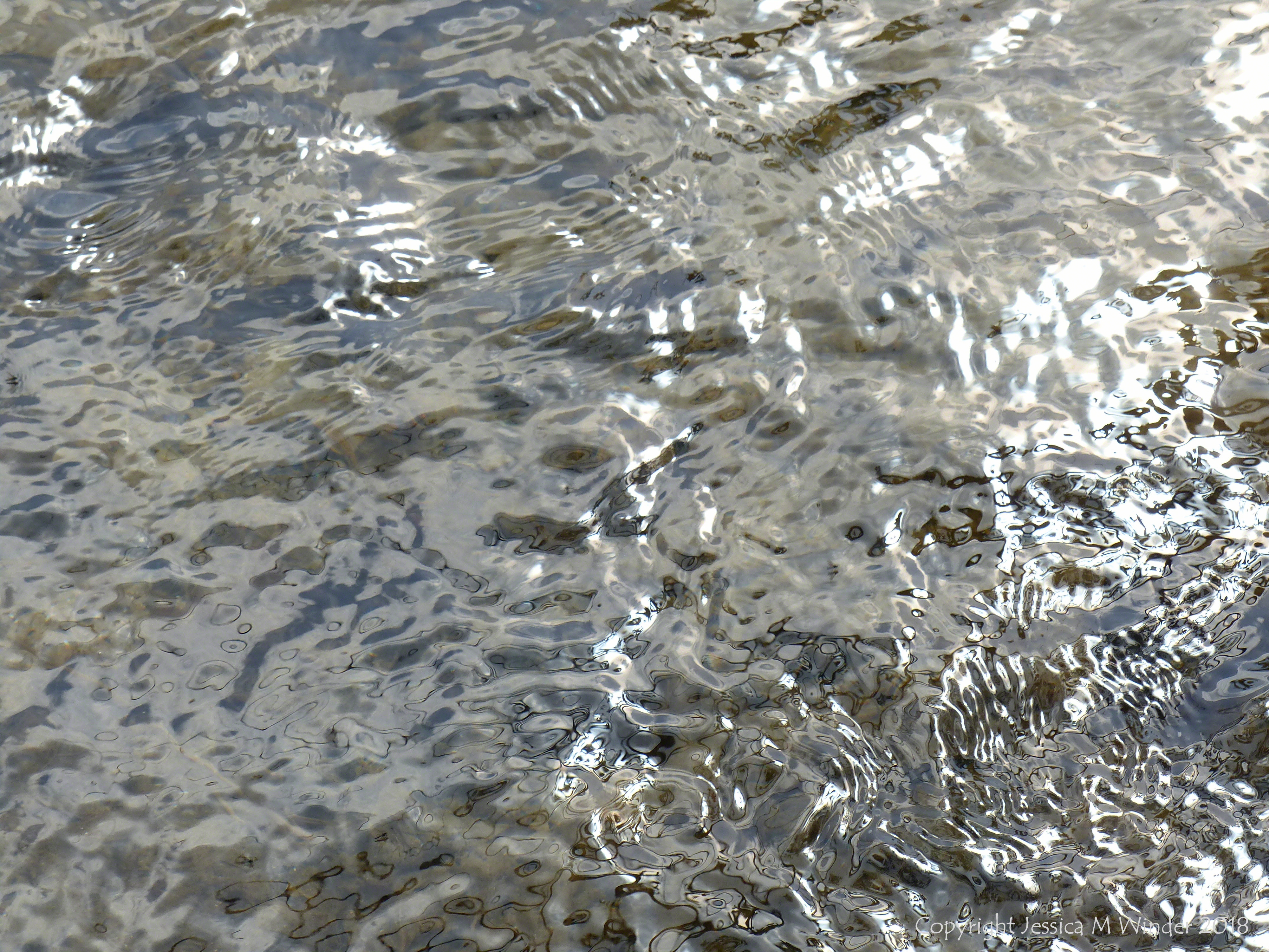 C S Reflections 3 – Silvery natural pattern and texture on the surface of flowing water in the Cerne stream in Dorset.