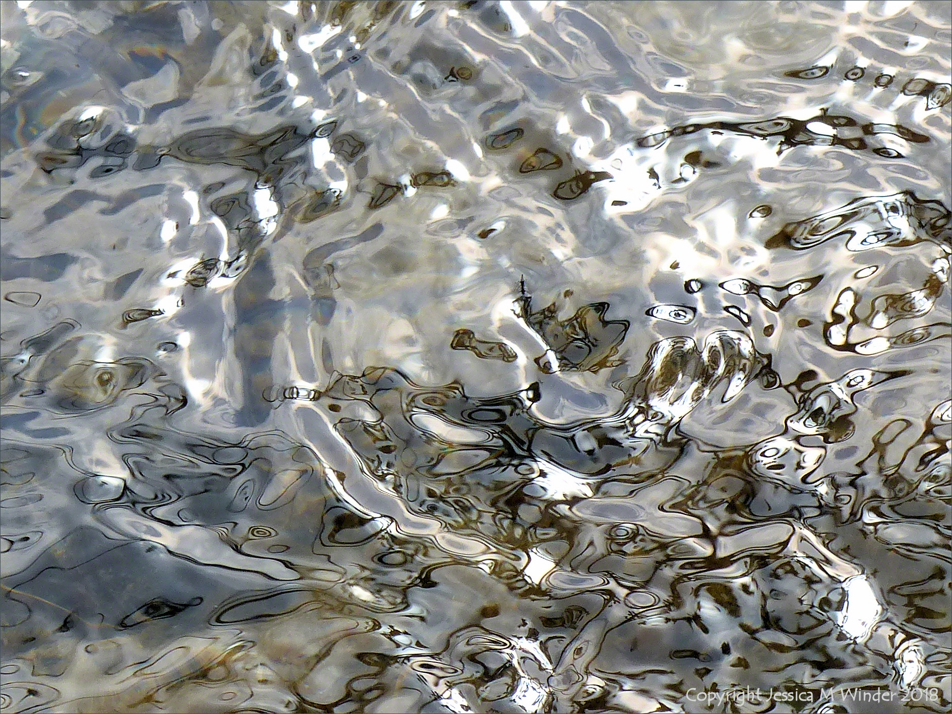 C S Reflections 1 – Silvery natural pattern and texture on the surface of flowing water in the Cerne stream in Dorset.