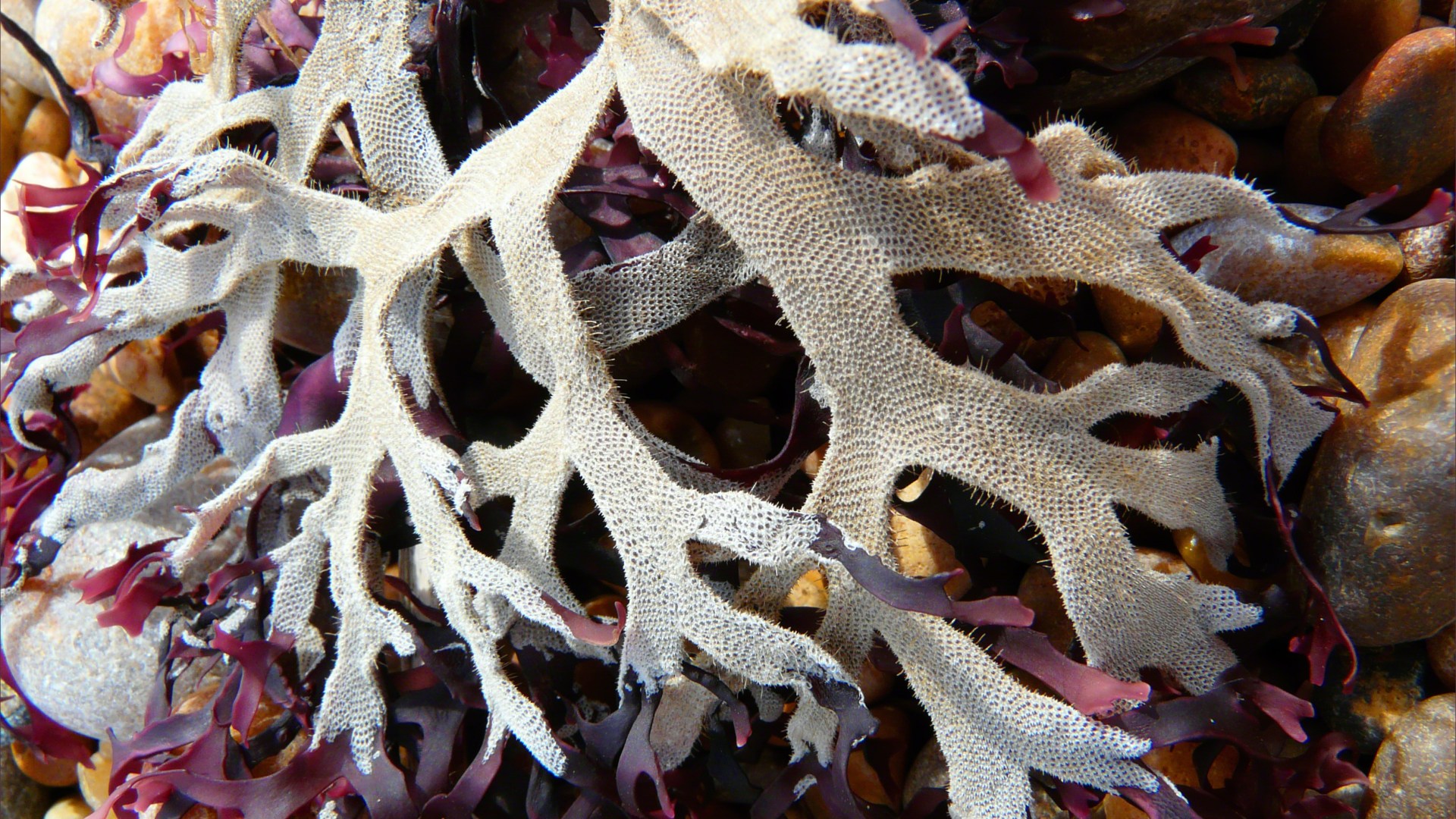 The small pebbles of the shingle seashore do not support much in the way of marine invertebrate life (at least not seashore creatures that can be readily observed by the casual visitor enjoying a bracing walk). A pebble beach is a difficult environment for small animals to survive and thrive because it tends to be constantly on the move. The larger, heavier, and more stable rocks lying between the tide marks can be covered with common British seaweeds arranged in interesting ways. Drift lines of seaweeds may be washed ashore and up the pebble banks. One time I visited Eype all these seaweeds were branching red Irish Moss beautifully covered with white lacey seamats or Bryozoa.