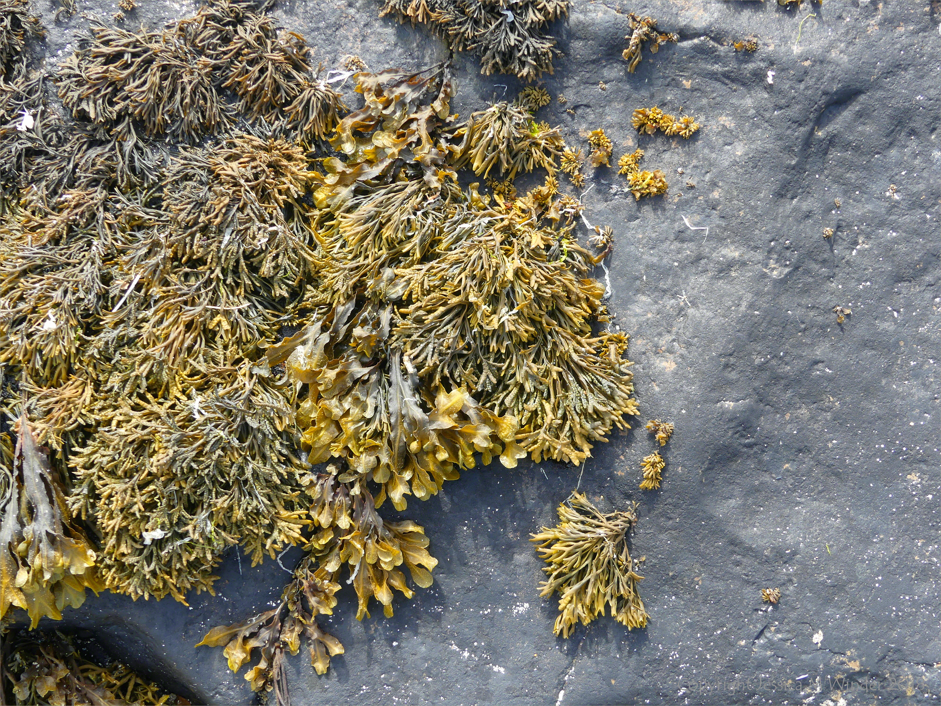 Point of Hellia 29 – Seaweed growing on Upper Stromness Flagstone with black biofilm at Point of Hellia in Orkney, June 2018