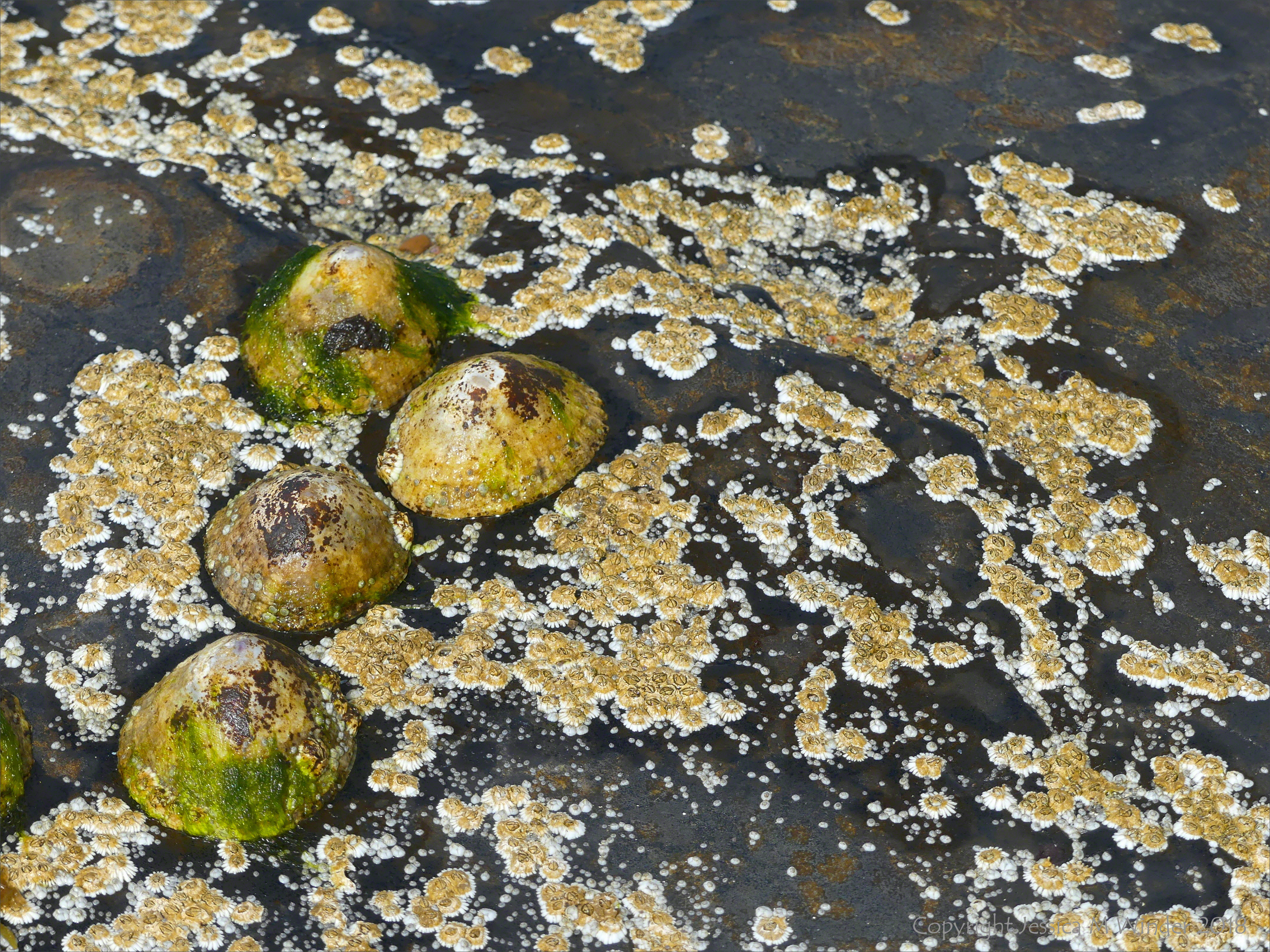 Point of Hellia 34 – Limpets and barnacles on rock covered with black biofilm at Point of Hellia in Orkney, June 2018