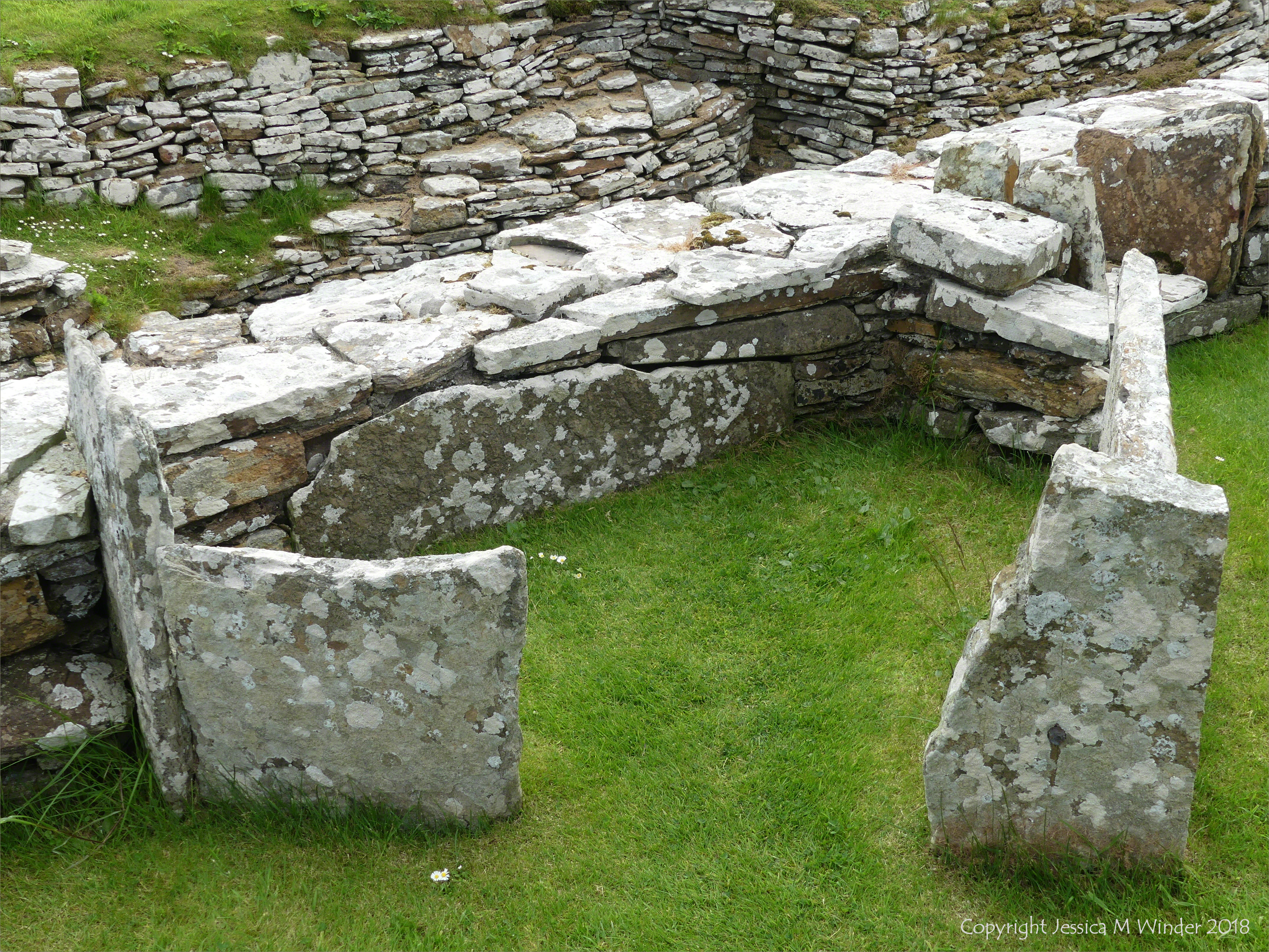 Broch of Gurness 8 – Maybe a sleeping area built into the side wall of a stone house amongst the archaeological remains of the Iron-Age settlement called Broch of Gurness on West Mainland in Orkney, built with slabs of Stromness Flagstone dating from the Devonian Period about 400 million years ago.