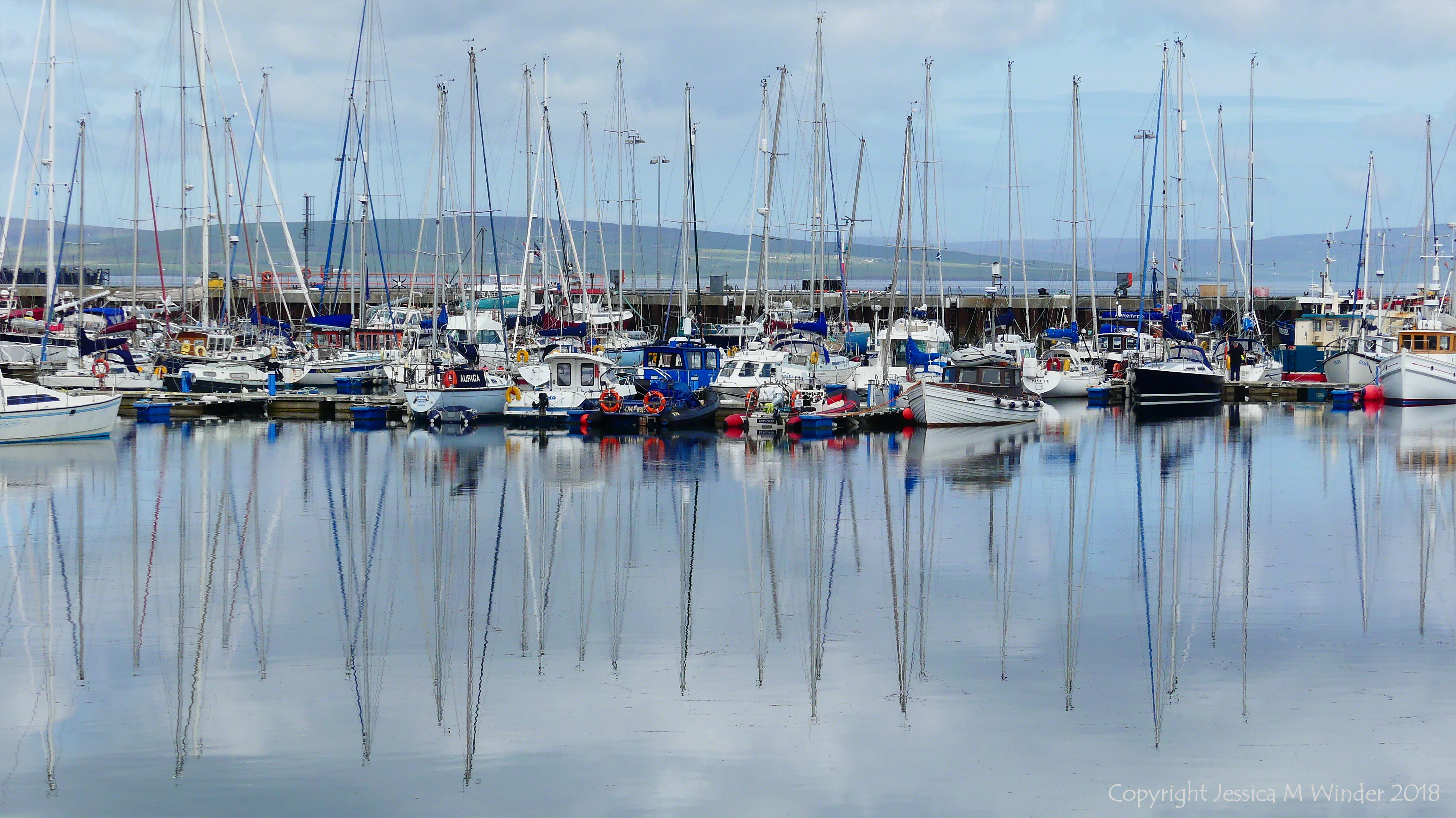 Kirkwall Harbour 1 – View from a walk around Kirkwall Harbour in Orkney showing reflections of yacht masts and rigging in the water, June 2018