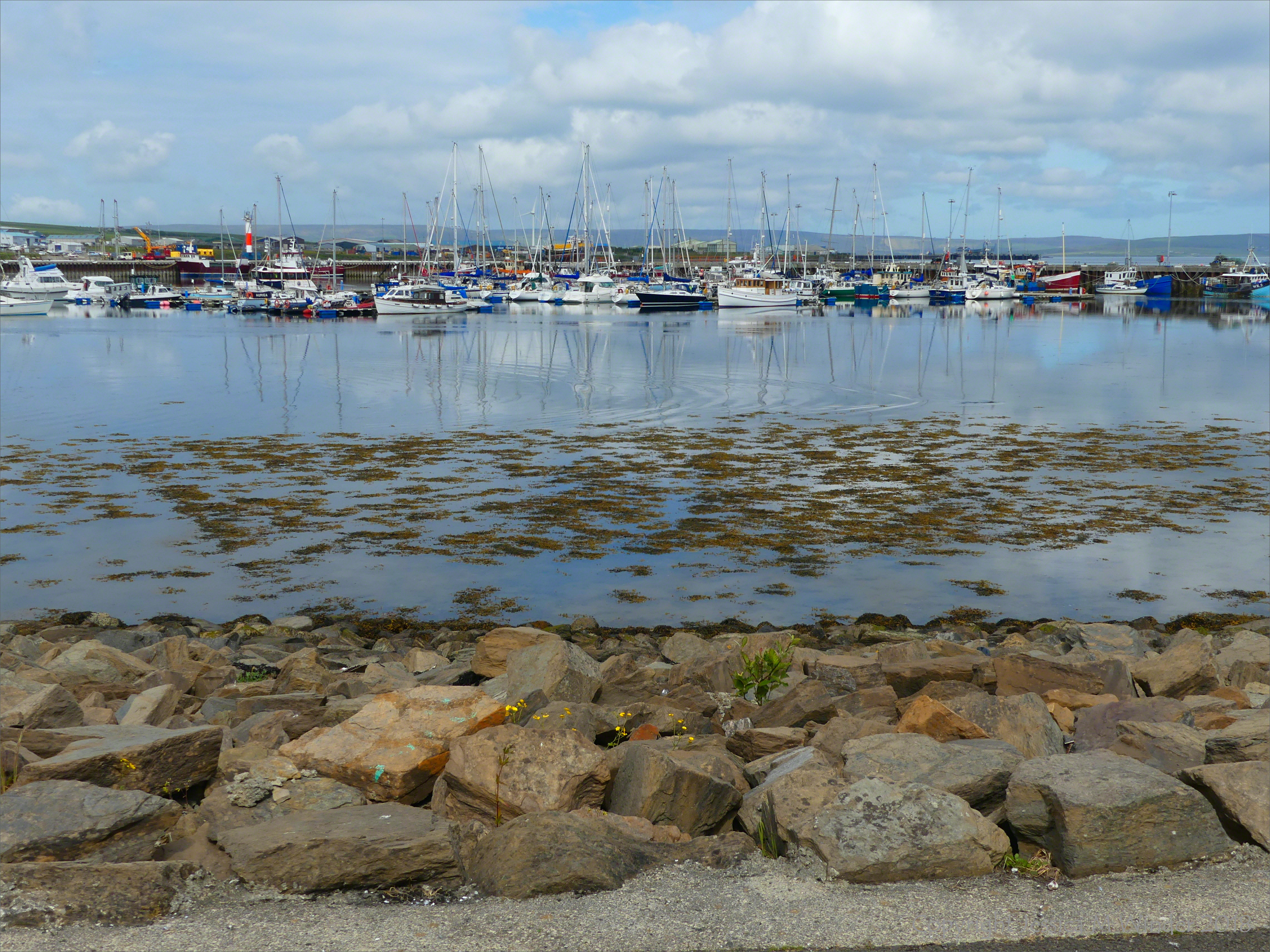 Kirkwall Harbour 4 – View from a walk around Kirkwall Harbour in Orkney showing low water and seaweed in shallow water near leisure boats, June 2018