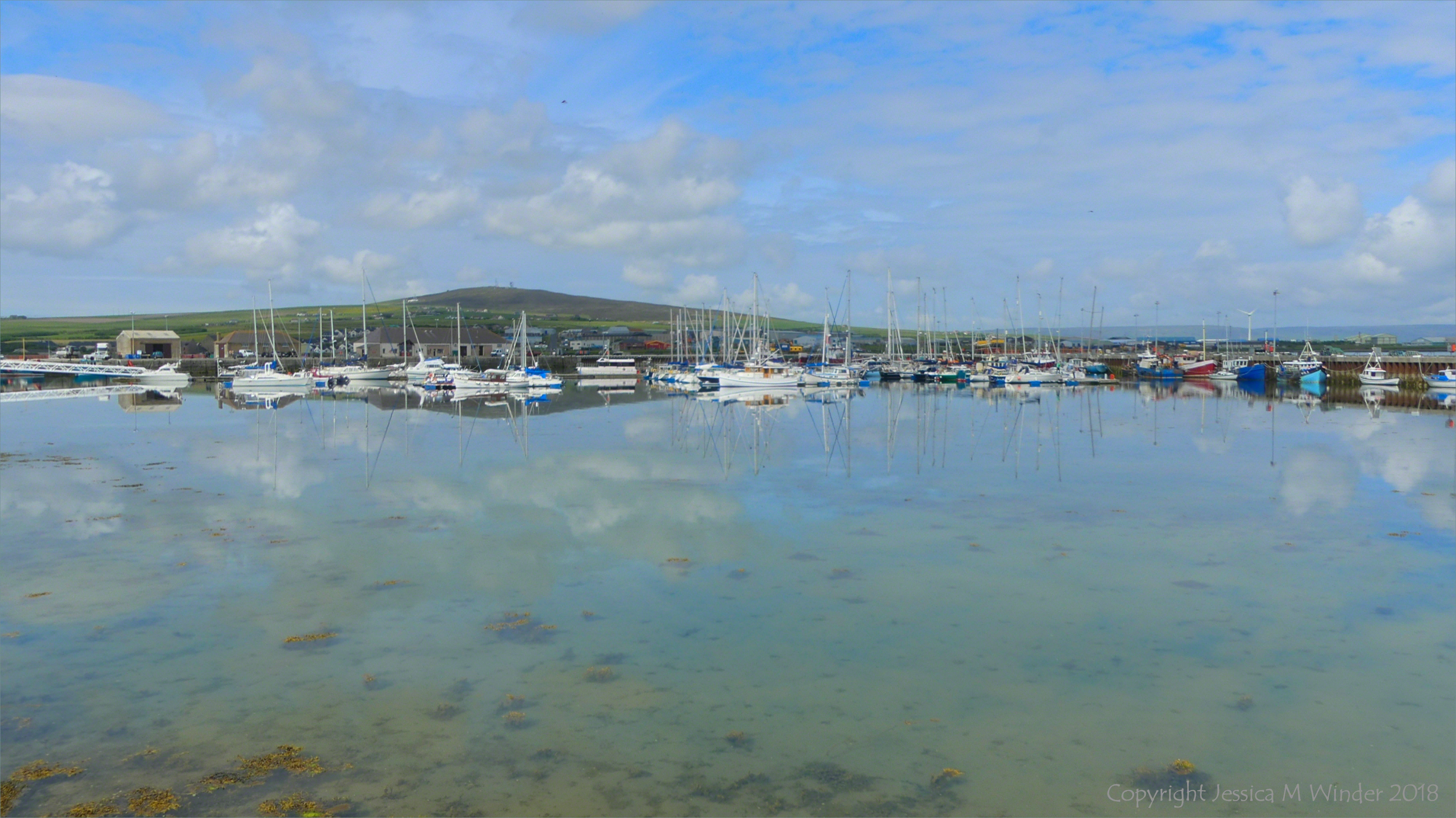 Kirkwall Harbour 3 – View from a walk around Kirkwall Harbour in Orkney showing seabed and algae in shallow water at low tide near moored boats, June 2018