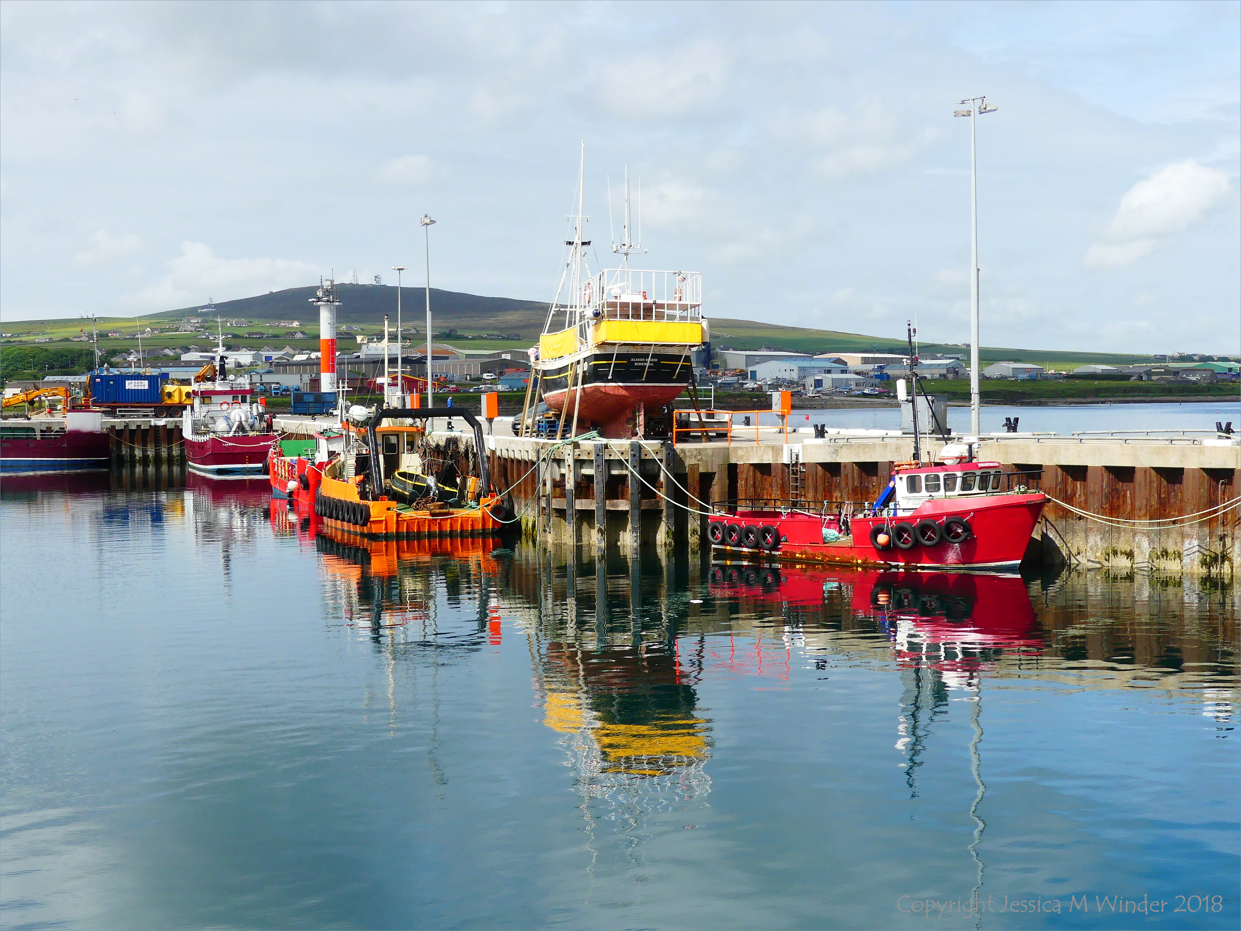 Kirkwall Harbour 9 – View from a walk around Kirkwall Harbour in Orkney showing working boats alongside the quay, June 2018