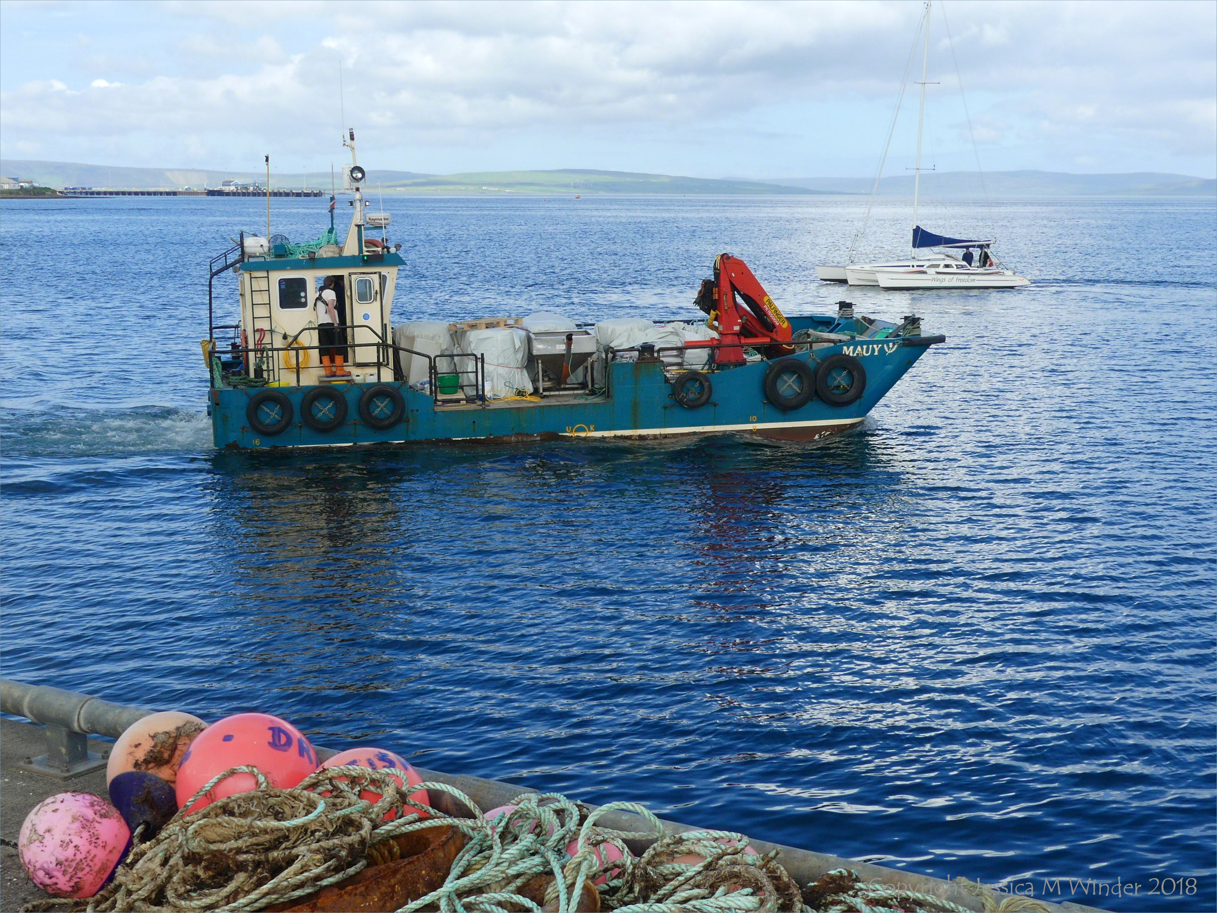 Kirkwall Harbour 10 – View from a walk around Kirkwall Harbour in Orkney showing a fishing boat leaving for open water of Wide Firth, June 2018
