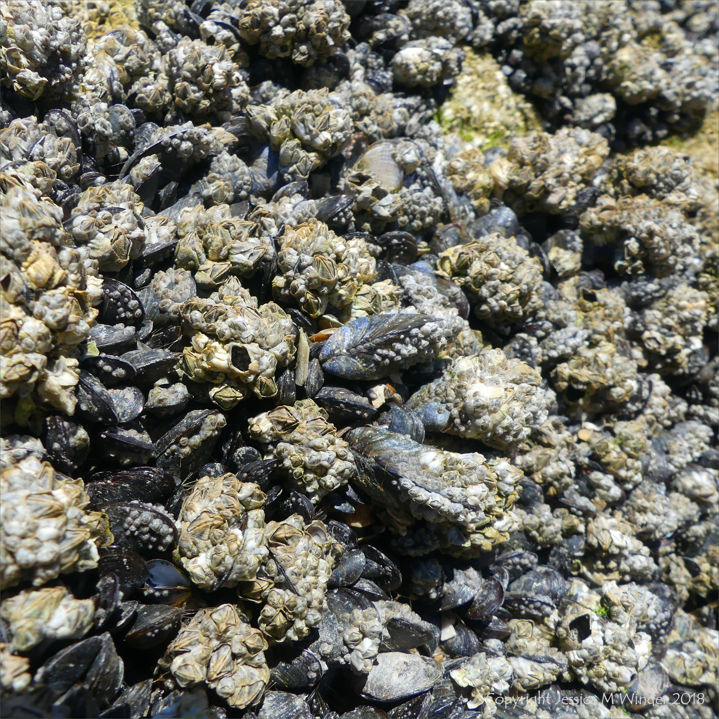Beach Finds at Rhossili Bay 18 – Barnacles encrusting mussels attached to rocks at Spaniard Rocks, Rhossili Bay, August 2018