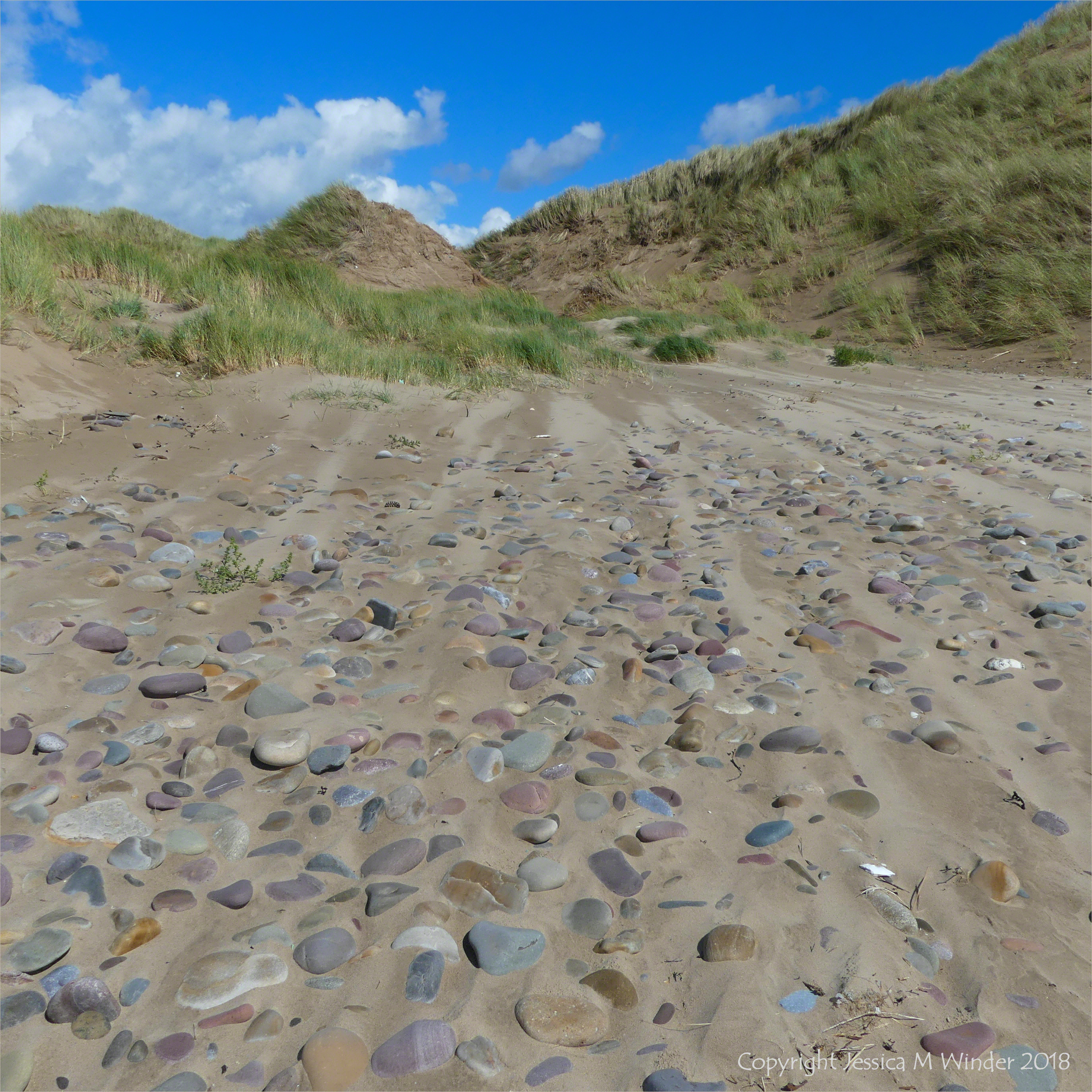 Beach Finds at Rhossili Bay 33 – Pebbles on the beach by sand dunes, aligned with the prevailing direction of wind scouring passages through the sand dunes, August 2018