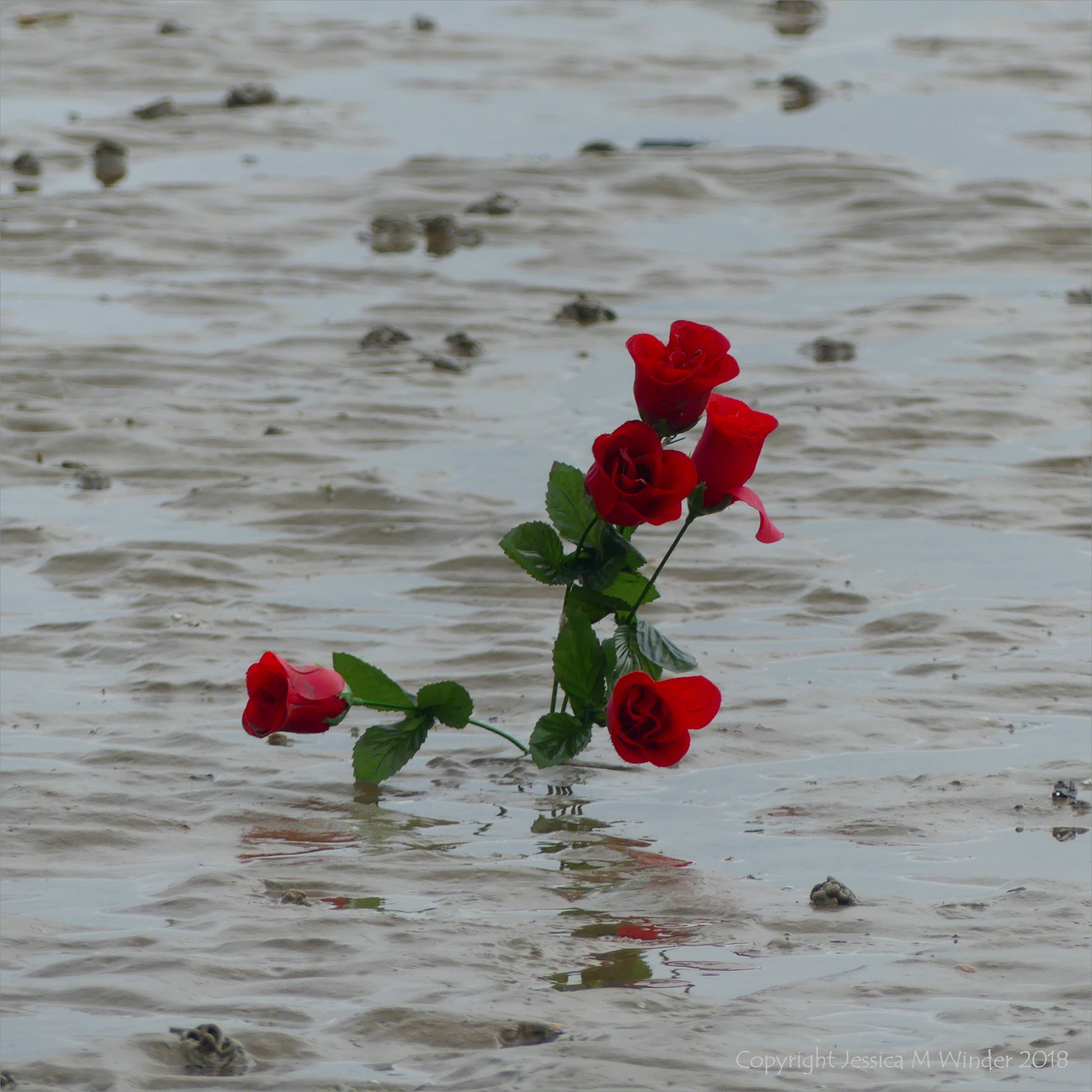 Mud & Roses 4 – Closer inspection revealed that the small patch of red far out in the mud was a bunch of artificial roses placed unobserved by someone as the tide receded down the shore.