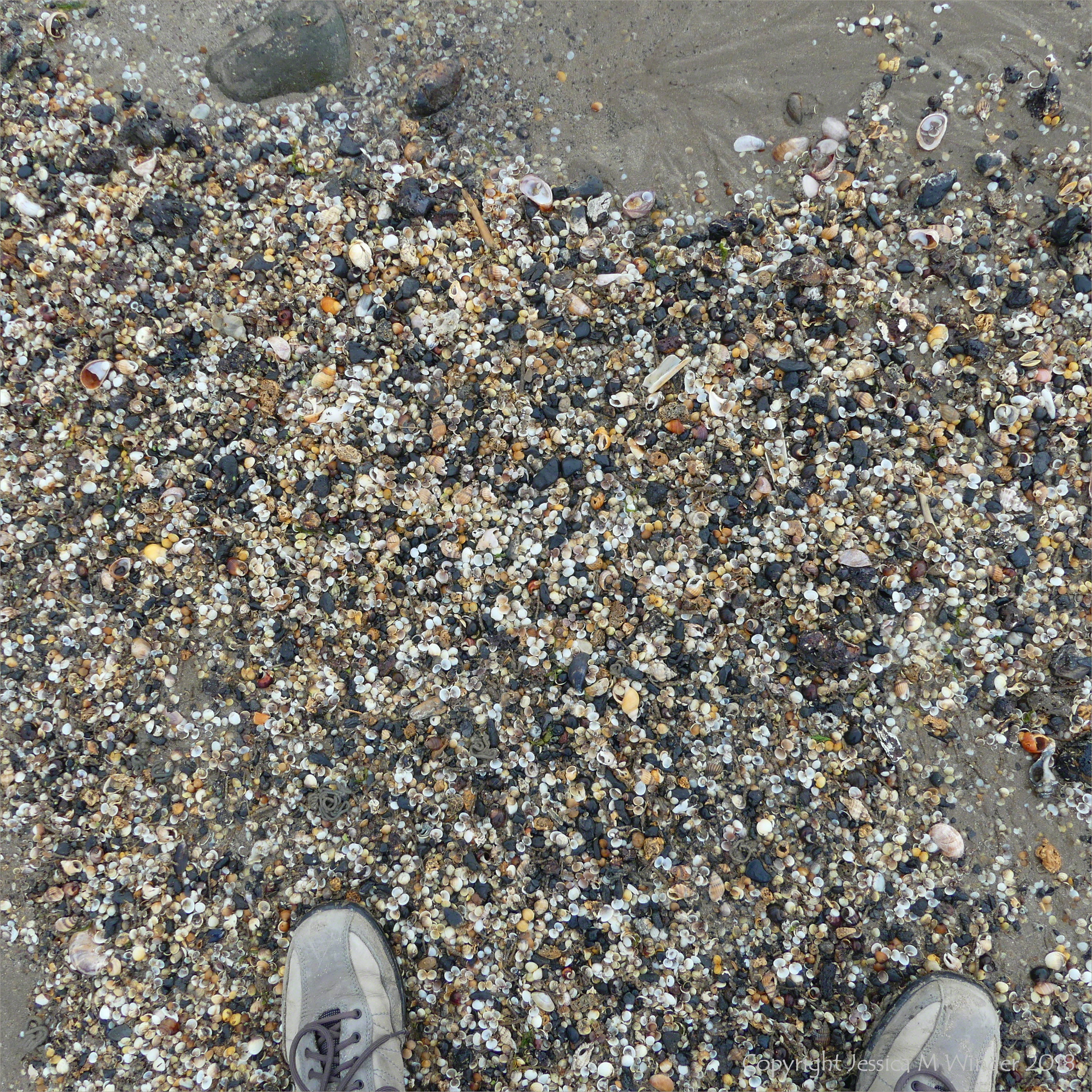 Tiny Cockles 2 – Mostly tiny cockle shells washed up on the strandline en masse with feet in picture to give scale