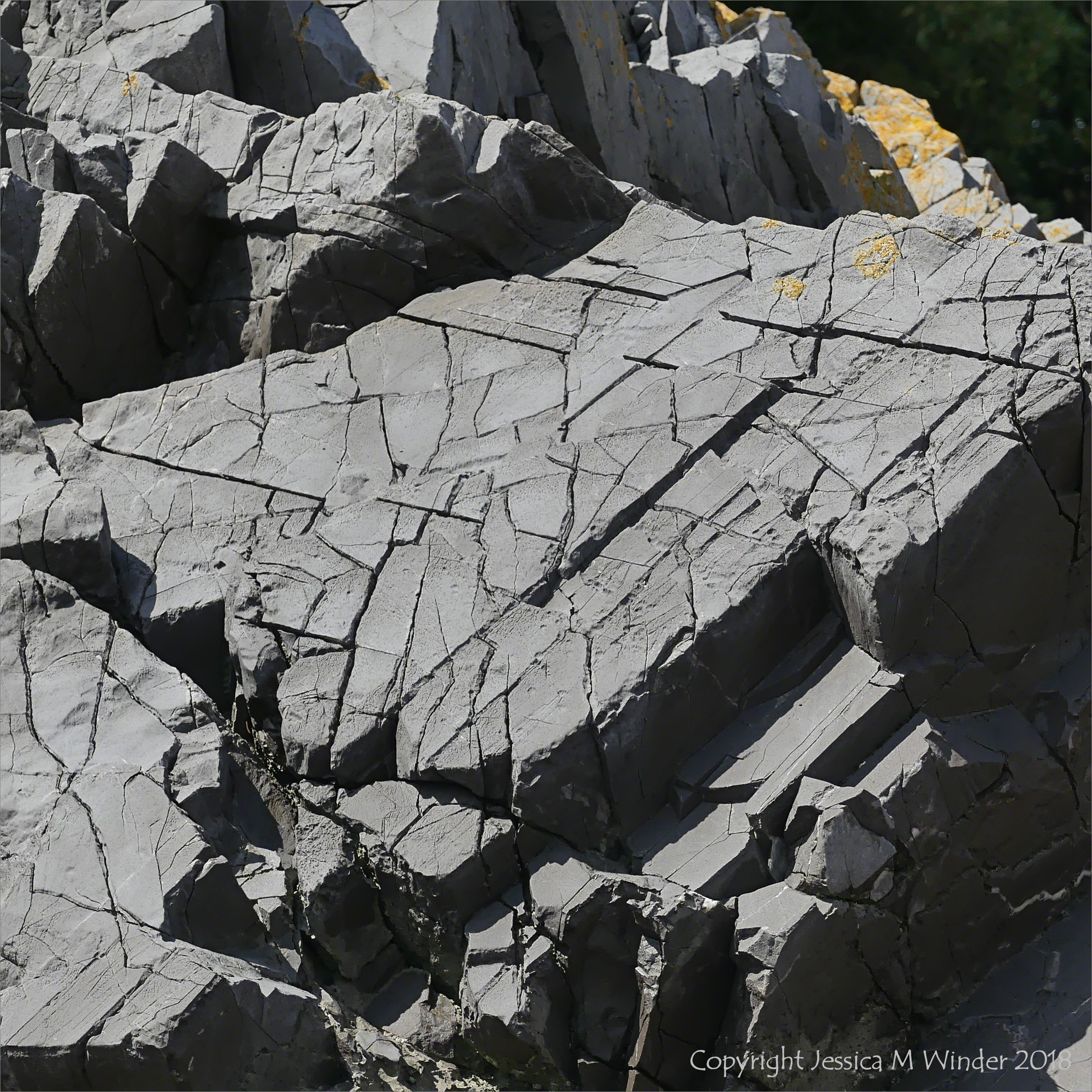 4. Rob, I have updated the post to show the location where I took the picture. Have a look at the post again and see what you think. I am guessing the breaks are fractures and they go down through the rock layer. There is a pattern to the breaks on the surface of the bedding plane which is roughly geometrical but I am uncertain whether the breaks show an orientation. I thought at first that it was High Tor limestone but it is a place where several rock types lie close together, There are many faults crossing Caswell Bay and I wonder if one of those might be responsible for the fracturing of these rocks, which subsequent to exposure have begun to show signs of karstification.